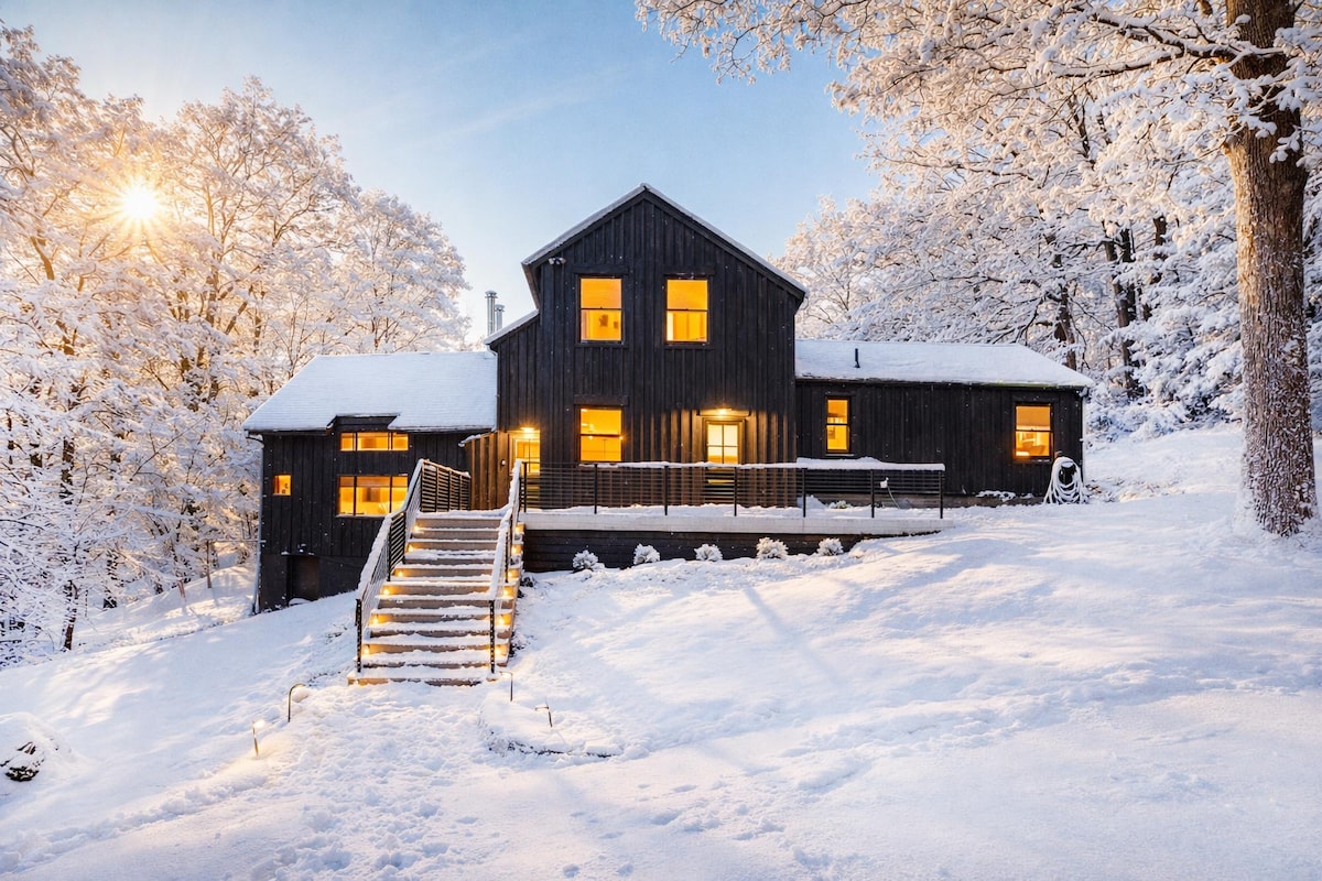 A winter scene is captured with snow covering a stone wall, accentuating the surrounding landscape. In the distance, the glimmering surface of Greenwood Lake is visible, framed by the hills beyond. A corner of the house shows a window reflecting the serene outdoor view.