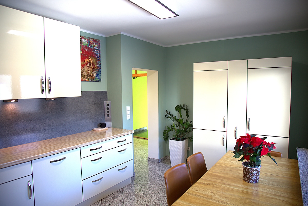 Whether for a visit to the trade fair, a short trip or for a business meeting in the financial metropolis of Frankfurt or the surrounding area, we will make your stay as pleasant as possible. The 62 sqm apartment has a separate entrance on the garden side of the house. It consists of a double bedroom, a cozy living-dining area with a modern and fully equipped kitchen, breakfast bar, cozy sitting area and a desk. Via the entrance hallway, you can access a Mediterranean-style bathroom with shower, toilet and double sink. In front of the apartment is a covered patio overlooking the garden. Here you can enjoy the fresh air or smoke a cigarette, which is not desired in the apartment. Flatscreen TV, DVD player, stereo, radio with iPod, Wi-Fi and a safe are available. If necessary, another room with an area of 23 square meters can be used additionally. It is equipped with a 2 m wide pull-out sofa bed, wardrobe, table and wall TV and can be accessed via the bathroom of the apartment. The apartment is located in a nice and quiet residential area in Bad Vilbel. The nearest S-Bahn station is about 8-10 minutes on foot and the S6 will take you to the centre of Frankfurt or to the trade fair in about 20 minutes. By car, you can reach Frankfurt via the B3 in 15-20 minutes.
