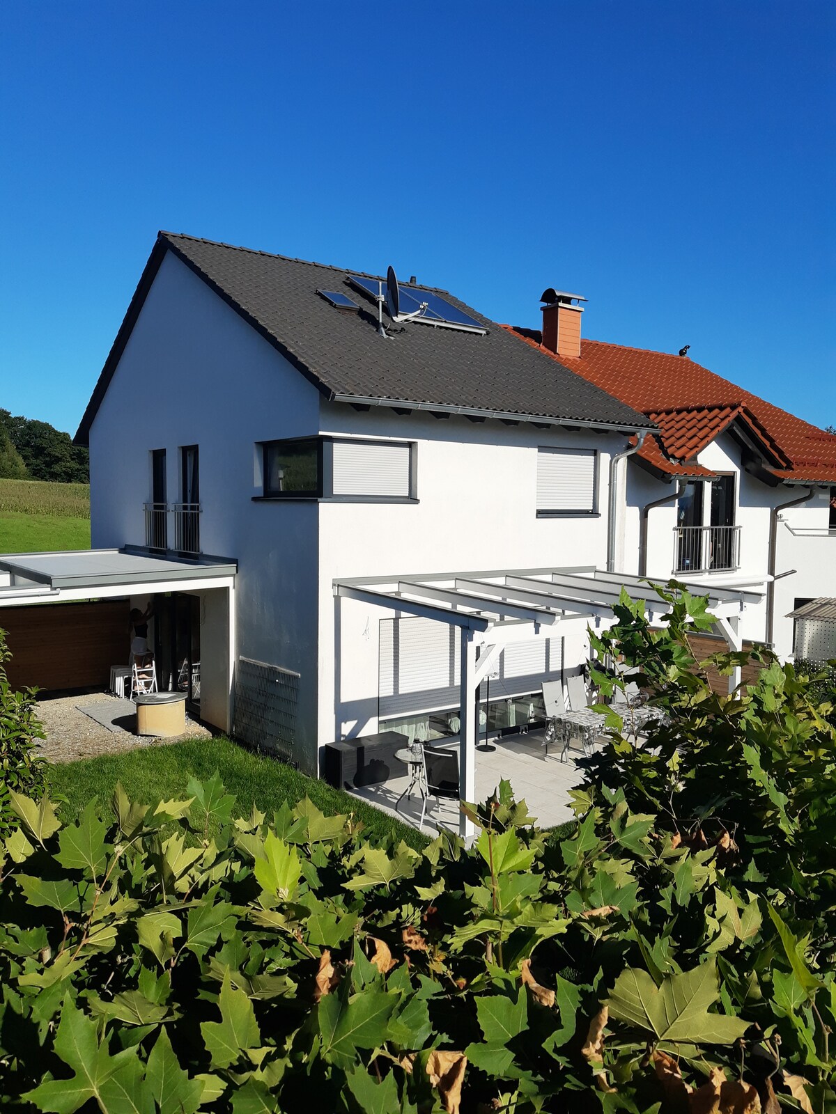 Rest and relaxation await you! This exceptional single-family home offers the best in comfort and relaxation. Elegant design/high-quality materials, Fireplace (remotely controllable with pellet function) Jacuzzi sauna Full kitchen Charbroiler Great views: whether at breakfast on the terrace or from the large panoramic window of the kitchen. The lovingly built ship container includes a guest bed/room, which can be used by more than 2 people.