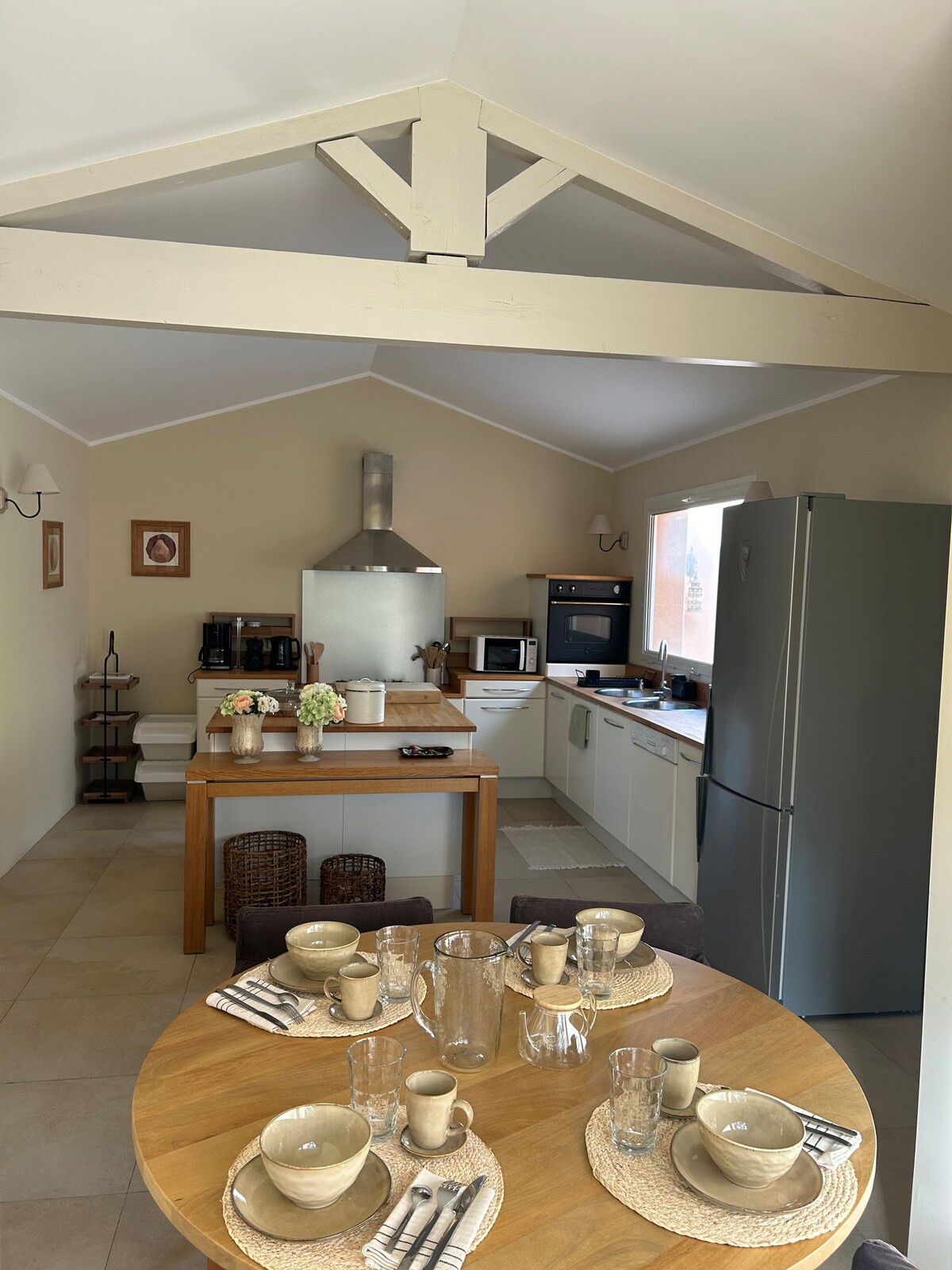 At the gateway to the Camargue near Nîmes, Arles, Les Saintes Marie de la Mère, Grau du Roi, Aigues Mortes Vacation home, air-conditioned with a beautiful covered terrace of 45 m², gas barbecue. It consists of a fully equipped kitchen open to the living room with sofa, flat screen TV, 2 bedrooms, walk-in shower, double sink, toilet, washing machine. Linens provided, private and secure parking. Wi-Fi.