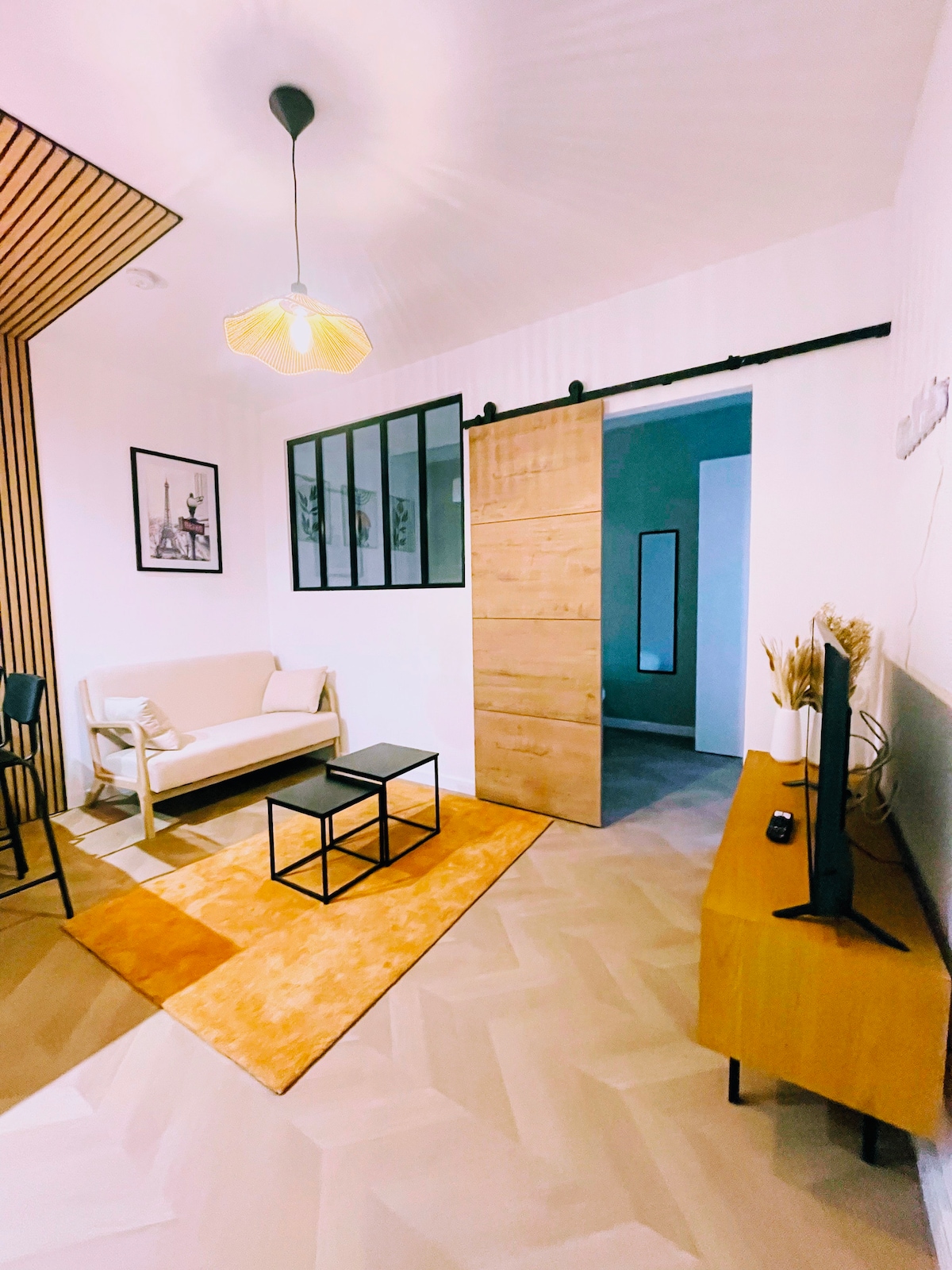 Charming 50 m2 duplex in the center of Nogent, on the 2nd floor of a very quiet residence, located 15 minutes walk from the RER A (station 15 minutes from Châtelet-les Halles and 45 minutes from Disneyland Park), 15 minutes from Bois de Vincennes and the banks of Marne and 2 minutes from the market. This duplex has just been refurbished, it is dual-aspect and bright and can accommodate up to 5 guests. It consists of a large living room overlooking a fully equipped open kitchen and two bedrooms upstairs.