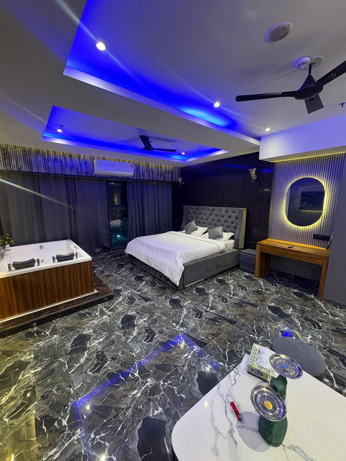 Luxury studio apartment designed for comfort, privacy, and relaxation. Featuring a private in-room jacuzzi, elegant interiors, warm lighting, and a cozy king-size bed, this space is perfect for couples, celebrations, or a peaceful city getaway. Ideal for romantic stays, birthdays, and anniversaries, the studio offers a clean, modern ambiance with essential amenities for a smooth and memorable stay. Relax, unwind, and enjoy a premium experience.