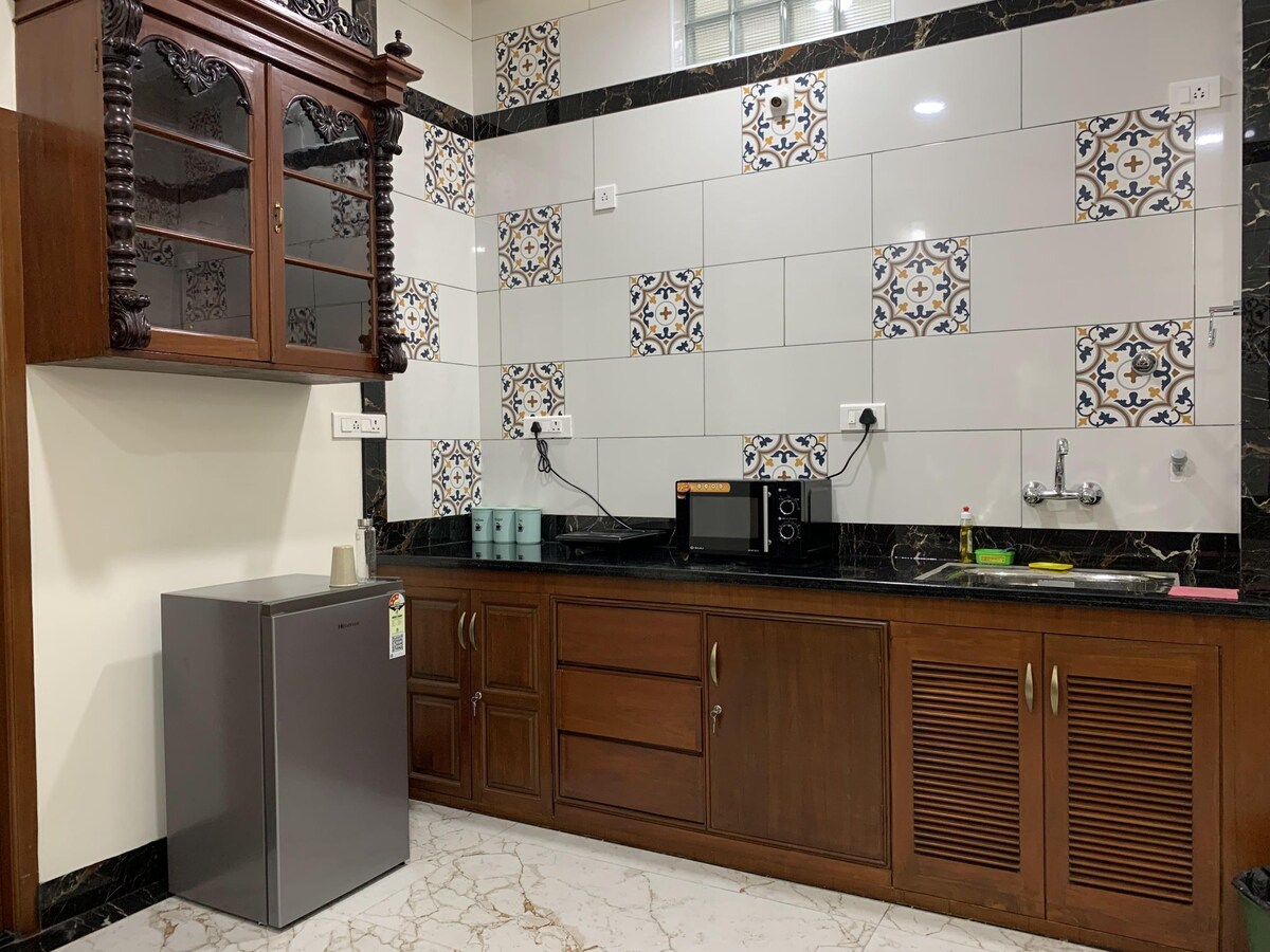 Completely Private with no sharing of any space, One Studio Room Small Apartment with a slab for kitchen & attached bathroom. New AC, cupboard, Queen bed with orthofoam mattress, ideal for two guests. kitchen area contains induction for cooking with utensils and cooking vessels. Hi-speed Internet connection for work from home Google TV with all Apps, AC, Fridge, Oven, Geyser, chairs, iron, etc, everything is there. Fully entilated place with 2 big windows. We need ID proof of all guests.
