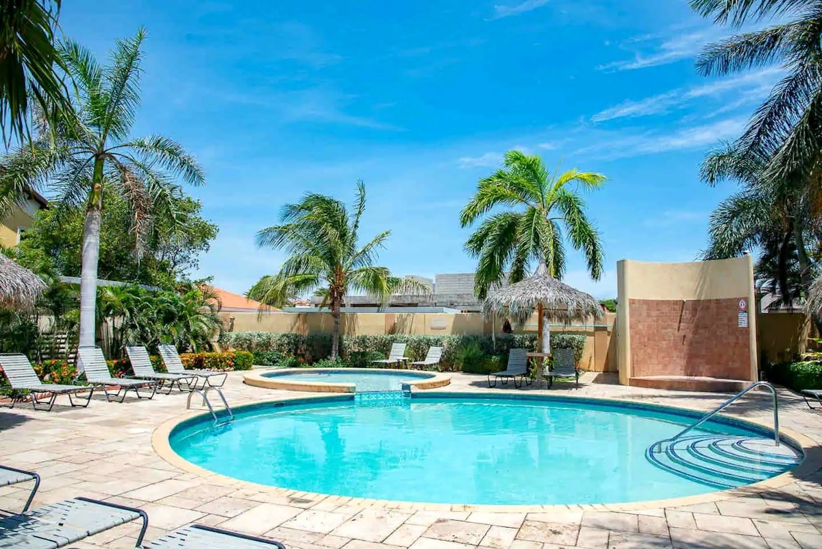 It's a 4 unit apartment complex with a swimming pool/with a shallow lounge area. There is a main door that welcomes all guest on to the property. Every apartment has a dedicated porch which leads to its private entrance. All apartment units have garden and pool view from the living room. There are 3 one-bedroom units and 1 studio apartment. Only 3-5 minutes drive to Eagle Beach and Palm Beach or a 15-20min. walk. You can rent one room or the whole complex to accommodate a big family or a group.