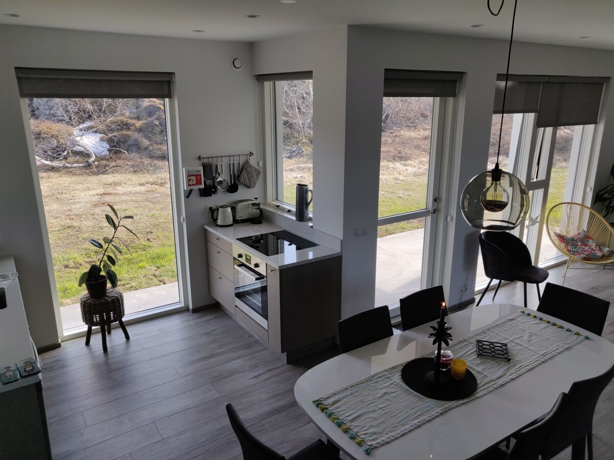 Our two bedroom cottage cuddled into nature in Húsavík suburb with a breathtaking view serves as a tiny home, away from home where you have a lot of privacy and comfort in as close proximity to the spirit of nature as possible. The location is extraordinary as it has breathtaking view, abundant bird-life, spectacular nature and wildlife, country comfort and urban activities and service in town. Walking paths are along the lakes and to surrounding places. Minimum rental is 2 nights.