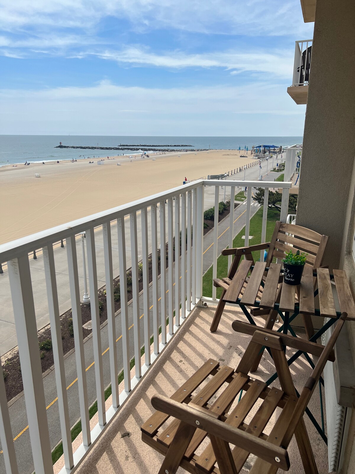 Nestled on the desirable north end of the boardwalk, close to the area’s best attractions, the top restaurants and bars. Just steps to the boardwalk, beach and ocean. Enjoy a nice meal or a early morning cup of coffee while enjoying a beautiful view of the Atlantic Ocean. Our studio includes a reserved parking space, saltwater pool, large BBQ deck area and a lawn on the beach. This small oceanfront complex is a great place for couples or a small family.