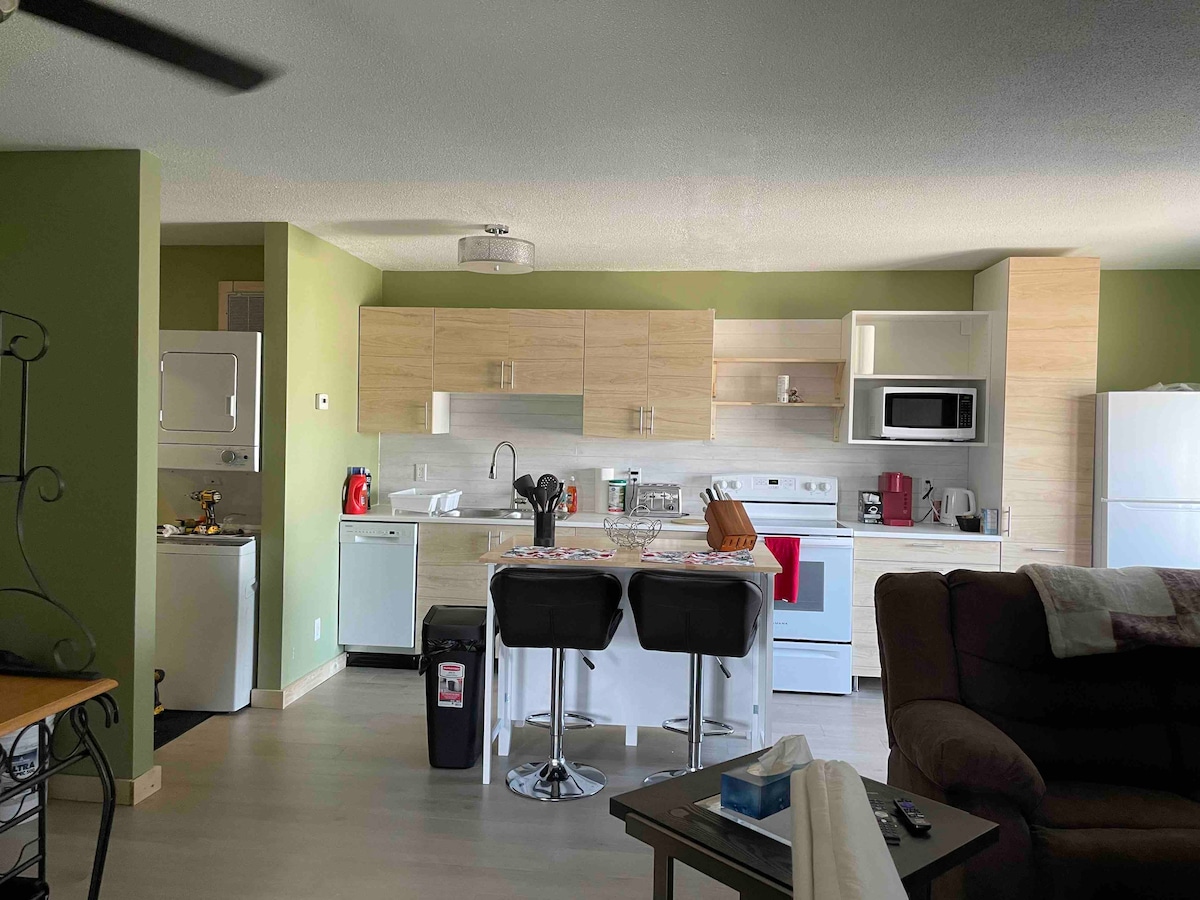 Enjoy a welcoming cozy Home away from Home. Centrally located apart on main street. On the 2nd floor, it's Air conditioned, clean, comfortable and fully furnished in a quiet building with only 4 units. Walking distance to 24hr convenience store, groceries, Coop shopping mall, restaurants, gas stations and easy access to all highways in/out of the city. Includes all utilities with wifi, parking, fully stocked kitchen, bedding, towels, washer/dryer and dishwasher. Discount for stays of 30+ days