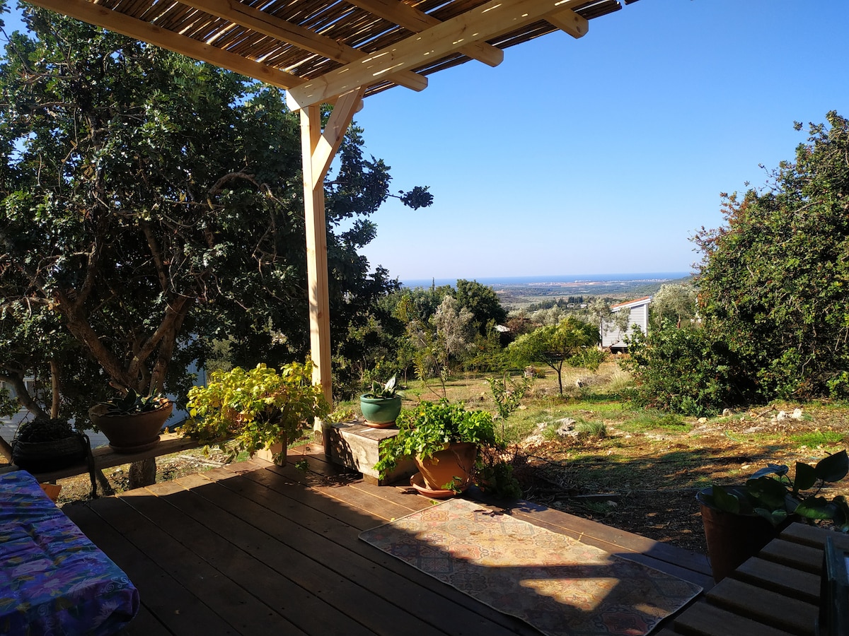 A magical two-room cabin, suitable for families (5 souls)/couples/individuals looking to relax. The cabin has an equipped kitchen (Pizza oven), Internet, TV with cable, a bath with hot water (gas boiler), a balcony overlooking the Mediterranean Sea. If your soul is asking for some rest in the magical nature, we invite you.