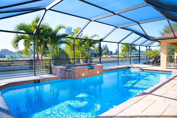 Escape to this 5-bed, 3-bath oasis in Cape Coral’s canal system, just minutes from the Gulf of Mexico by boat. Relax in the lanai-covered saltwater pool and hot tub, surrounded by tropical landscaping. Perfect for families, pets, and biz travel, the home features a spacious kitchen, multiple TVs, cable TV, and water views. Just 5 mins to beaches, 10 mins to dining & shopping, and 35 mins to Fort Myers Airport—your ultimate Florida escape awaits! Moderate cancellation policy & no cleaning fee!