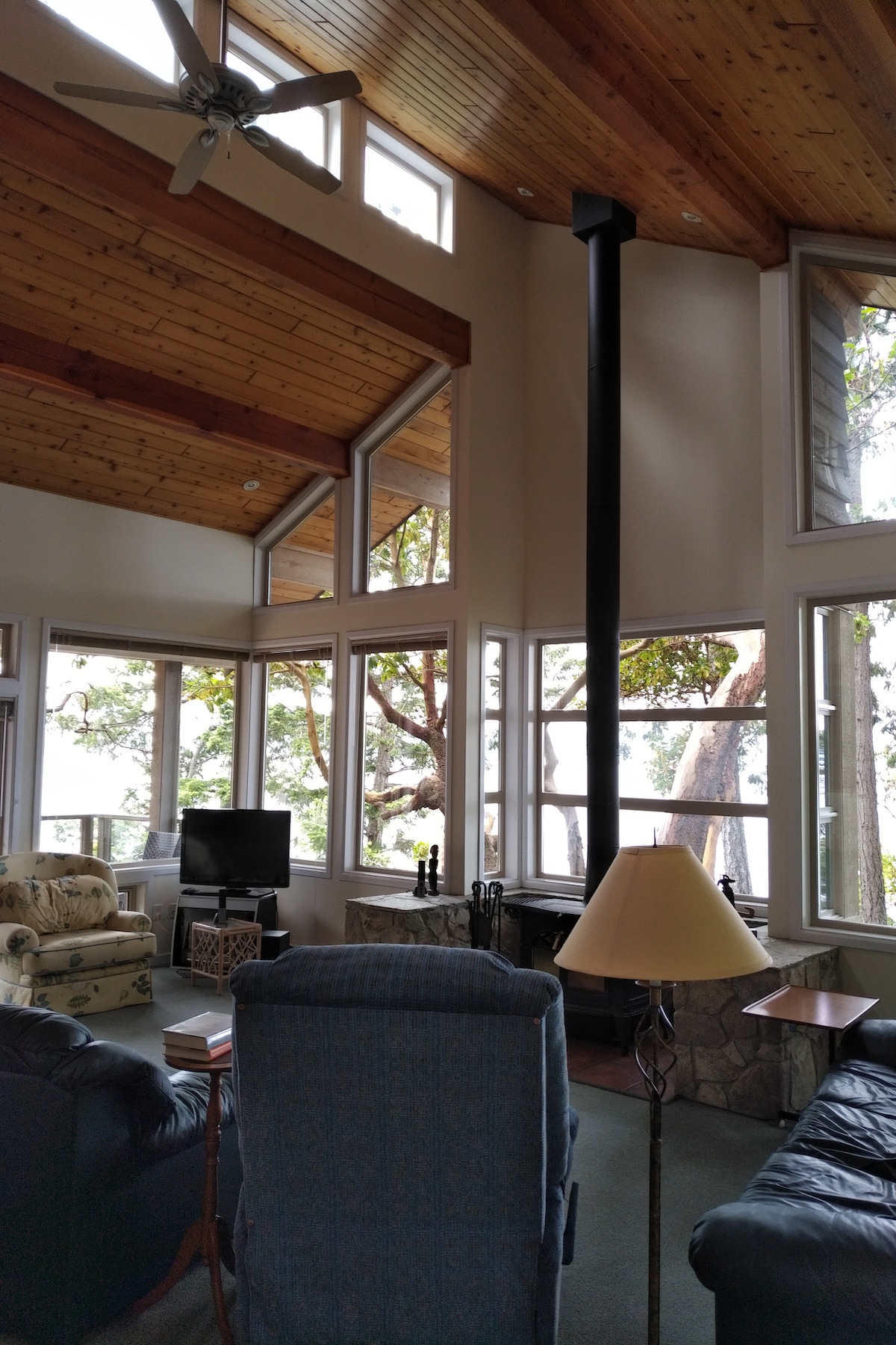 Get away from it all during these times! Breathe the fresh sea air as you are surrounded by sea and Arbutus trees on a point. If you're lucky, whales will swim right by while you're on the deck or the lookout. Clean. Four bedrooms; three bathrooms; a large living room; a study and more! Absorb nature. Dine to sunsets through the trees. And warm up by the fire as you try the piano. My on-island contact is here for you. Welcome to "Storm End"!
