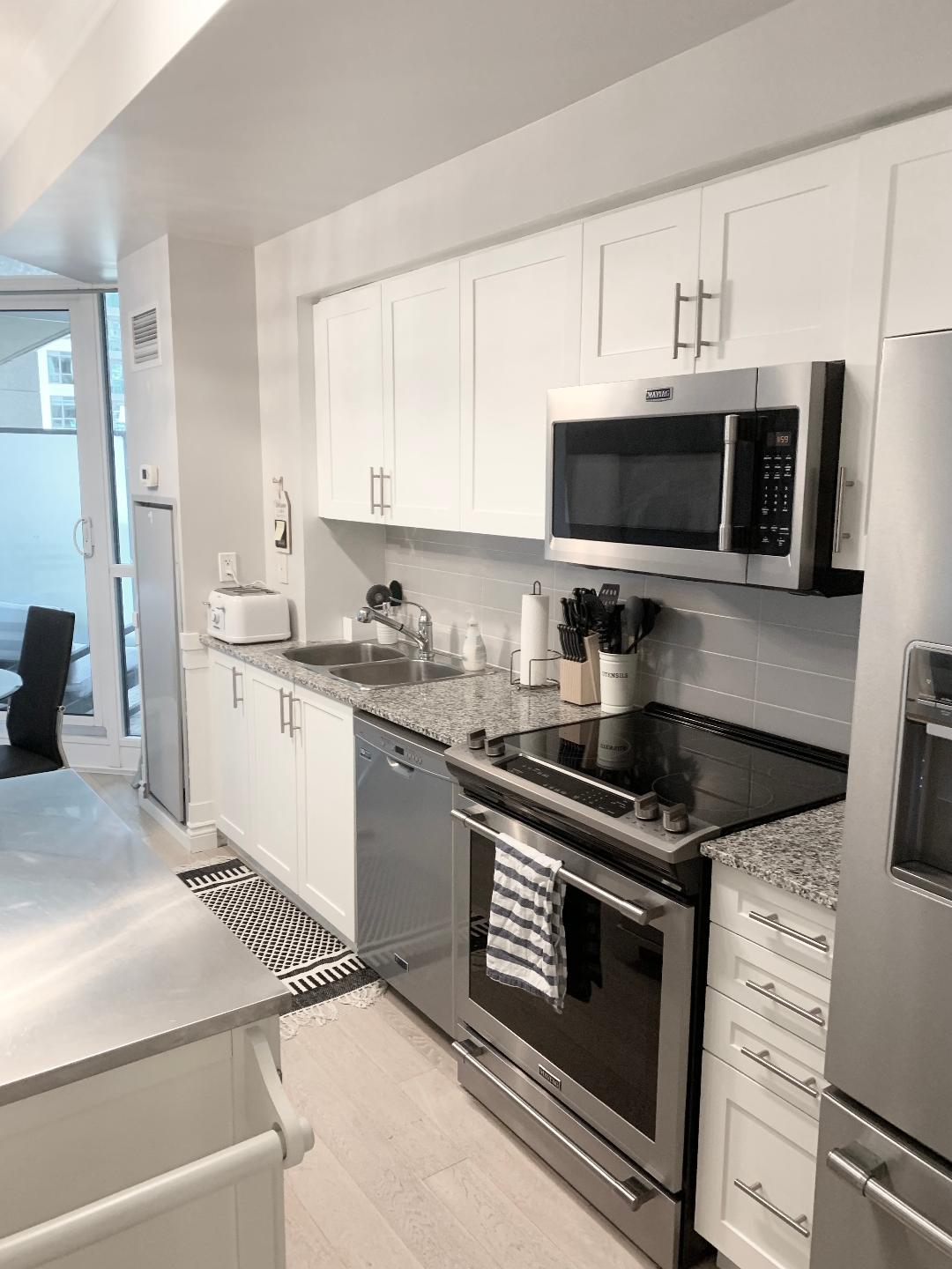 Luxury newly furnished home away from home in central downtown 300 Front Street with balcony CN Tower view. 2 Bedroom 2 Bath, Comfortable King bed TV en suit, Double bed TV w blackout curtains Enjoy in building Gym, Steam room, Outdoor pool with 360 degree view of the city, Whirlpool, and BBQ. Steps away from CN Tower, Rogers Centre, Aquarium, Metro Convention Centre, short walk to Scotiabank Arena, the lake, Bell Lightbox, Billy Bishop Airport, Union Station, Entertainment District and more