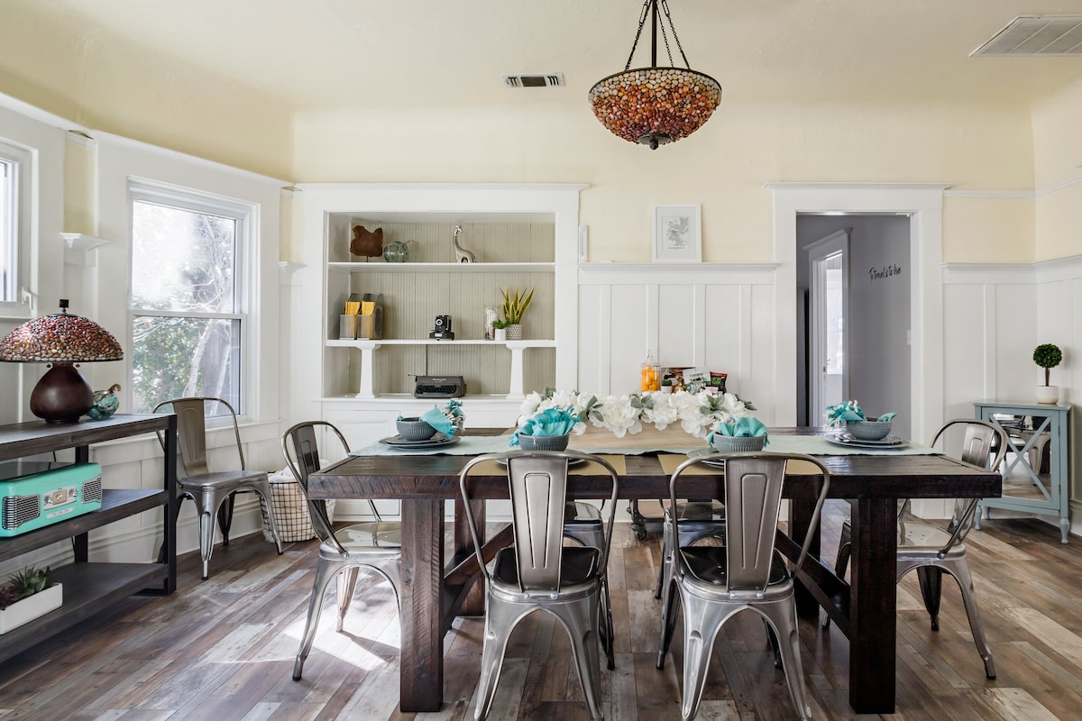 Discover a countryside getaway in the city in this beautiful charming 1911 bungalow with modern amenities. This home features rustic wood accents w modern finishes, neutral grays & blues, & backyard oasis with BBQ and salt water pool. Historic neighborhood w majestic trees amid restaurants you can walk to. Please note there is a downstairs apartment that’s part of this house but with a separate entrance. The cleaner will access the stock room in the backyard for a short time.