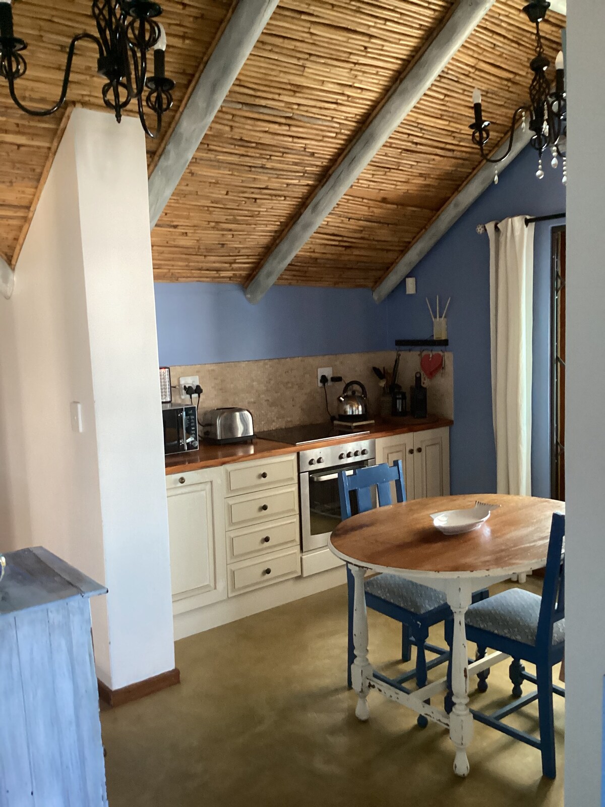 Escape to our enchanting rock cottage nestled in the serene mountains. This cozy hideaway offers breathtaking views of the surrounding peaks and lush valleys, making it the perfect sanctuary for nature lovers and those seeking tranquility. Sip your morning coffee on the stoep as you take in the panoramic views. By day, explore hiking trails and discover hidden caves and waterstreams. By night, relax under a blanket of stars, far away from city lights and noise.