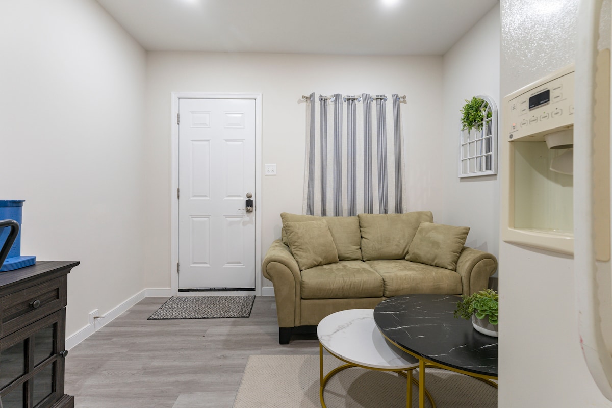 Guest Suite apartment , on the ground floor. located on the back side of the house. The apartment includes 2 queen beds, 50 inch TV, kitchenette, living room dining area, and full bath. This apartment is fully private with a private entrance on the backside of the house. (no shared spaces). Please include total number of guests.