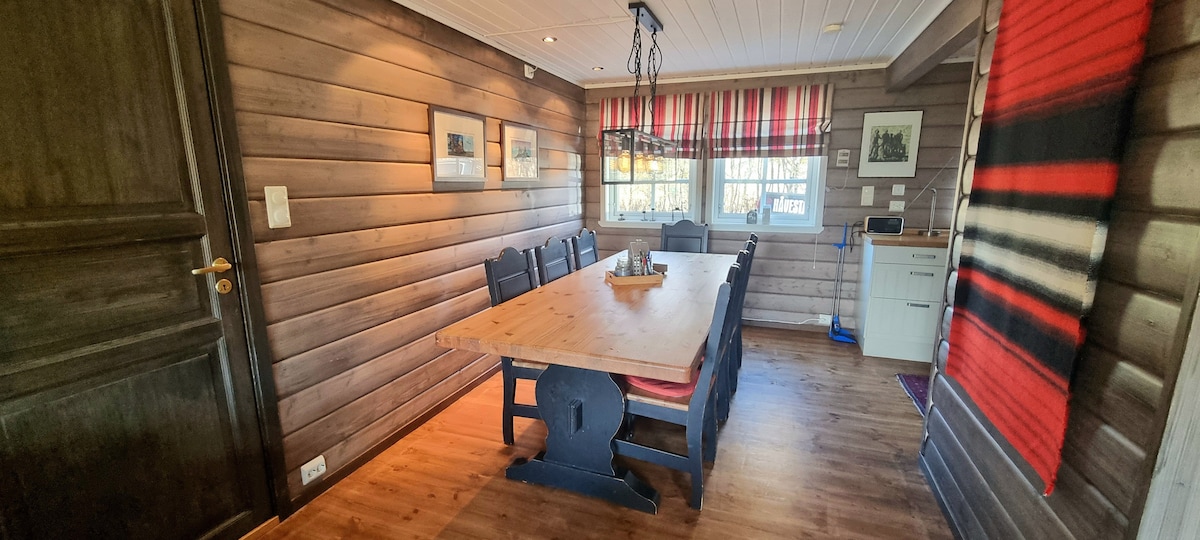 Spacious, great cabin for 1-2 families. 5 bedrooms, 2 floors, 2 living rooms and 2 bathrooms with shower, sauna. Sunny location with terrace and great views. 50 m to prepared cross country tracks and about 2 km to Bortelid ski and alpine center and shop. Internet
