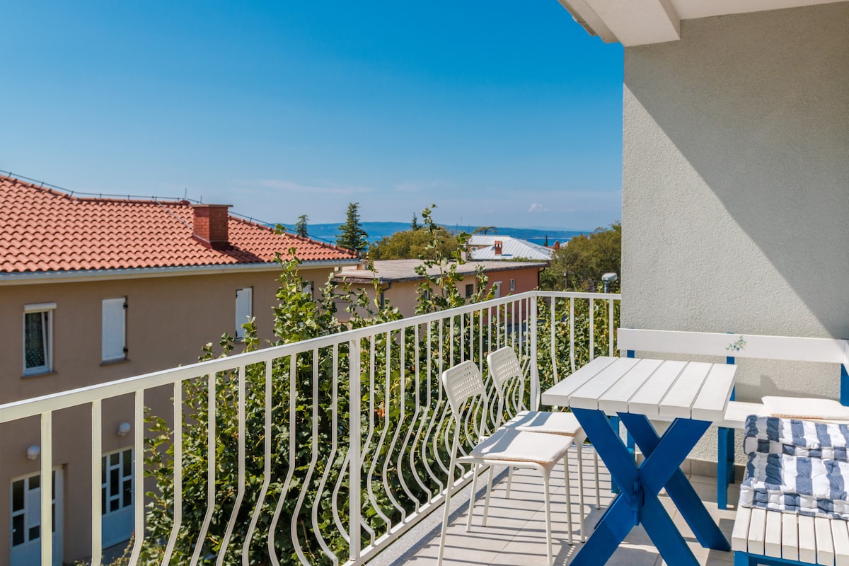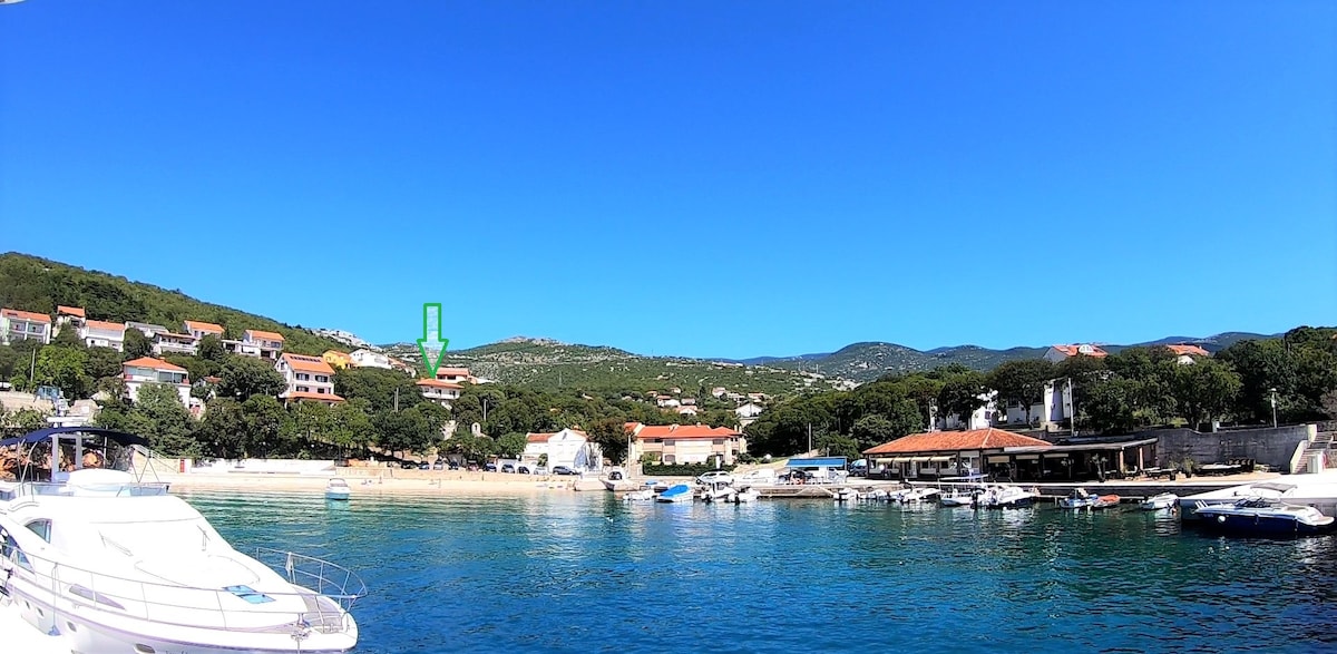 100m2 apartment with huge terrace and beautiful view on sea and island Krk, 50m away from the restaurants and beaches. Ideal for accommodate up to 9 guests. Free high speed internet connection (50MB/s download speed, 9 MB/s upload speed).