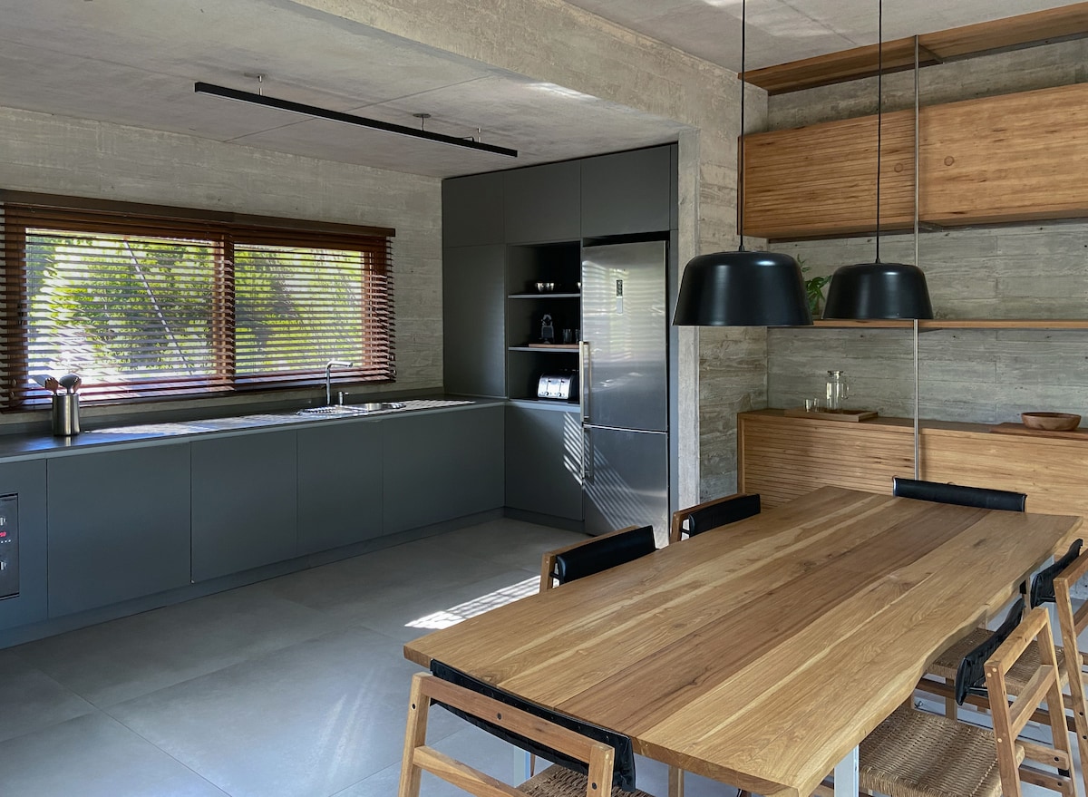 Incredible Concrete Micro House in the middle of the forest, respecting the nature of the place, unique environment with a queen bed, desk table, 2 chairs and WiFi. Bathroom with shower, sink, toilet. Kitchenette with sink, electric kettle, microwave and refrigerator with freezer, it is NOT for cooking. Very bright with the sea 700 meters away and the shopping center 600 meters away. This beautiful house is hidden behind the main house with total privacy and autonomy. Outdoor grill for common use of the place. Welcome!