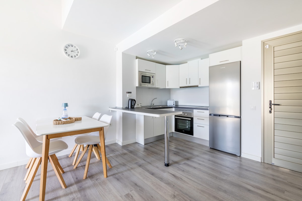 Cosy and modern flat consisting of a living area, double bedroom, bathroom and balcony, ideal for relaxing. Access to the complex's swimming pool, where you can cool off and enjoy the sun. Strategically located: close to the airport, a convenient starting point for exploring this unique island and a stone's throw from the Paseo Maritimo, perfect for walks along the seafront and moments of relaxation. The ideal choice for a comfortable and peaceful stay.