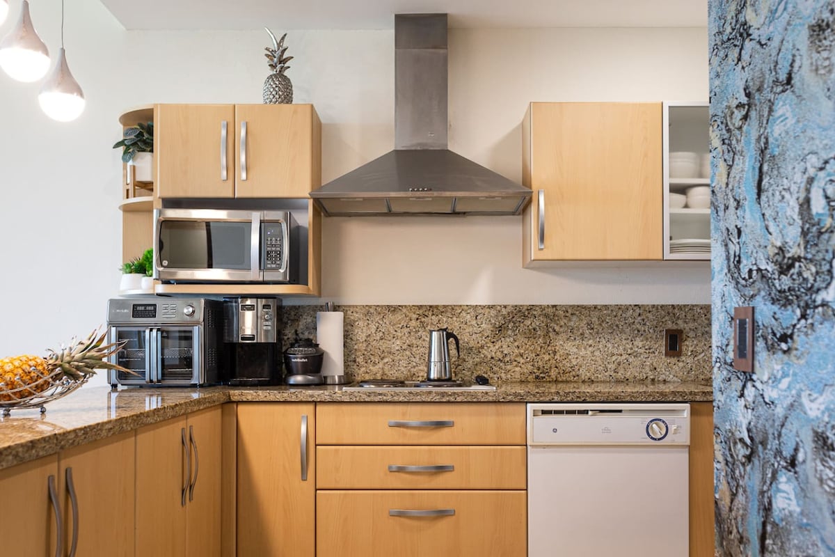 Condo Rosina is a freshly updated 1-bedroom condo on the 4th floor of 3.14 Living in Nuevo Vallarta repainted in June 2025. Enjoy mountain views and a cozy balcony with BBQ and sunrise view. Sleeps 2 with a king bed, 1 bathroom with shower, fully equipped kitchen, coffee station, high-speed internet, great new A/C, and a dedicated workspace. Spacious living area with large couch. Walk to the beach in 8 minutes or enjoy cafés, restaurants, and shops just downstairs. Peaceful and well located.