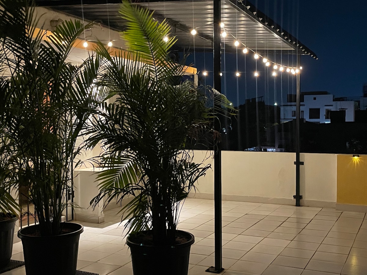 Chic 1 RK Loft – The DEN, a cozy urban escape. Ideal for solo travelers, couples, or remote workers, this stylish, self-designed space blends modern comfort with rustic charm. Very close to the US embassy and other consulates. A comfy, quite and completely private space, a fully equipped kitchen for light cooking, and a calming, well-lit interior. Unwind on the charming balcony or relax with a movie—perfectly nestled in a quiet area near the city buzz. Your peaceful retreat awaits!