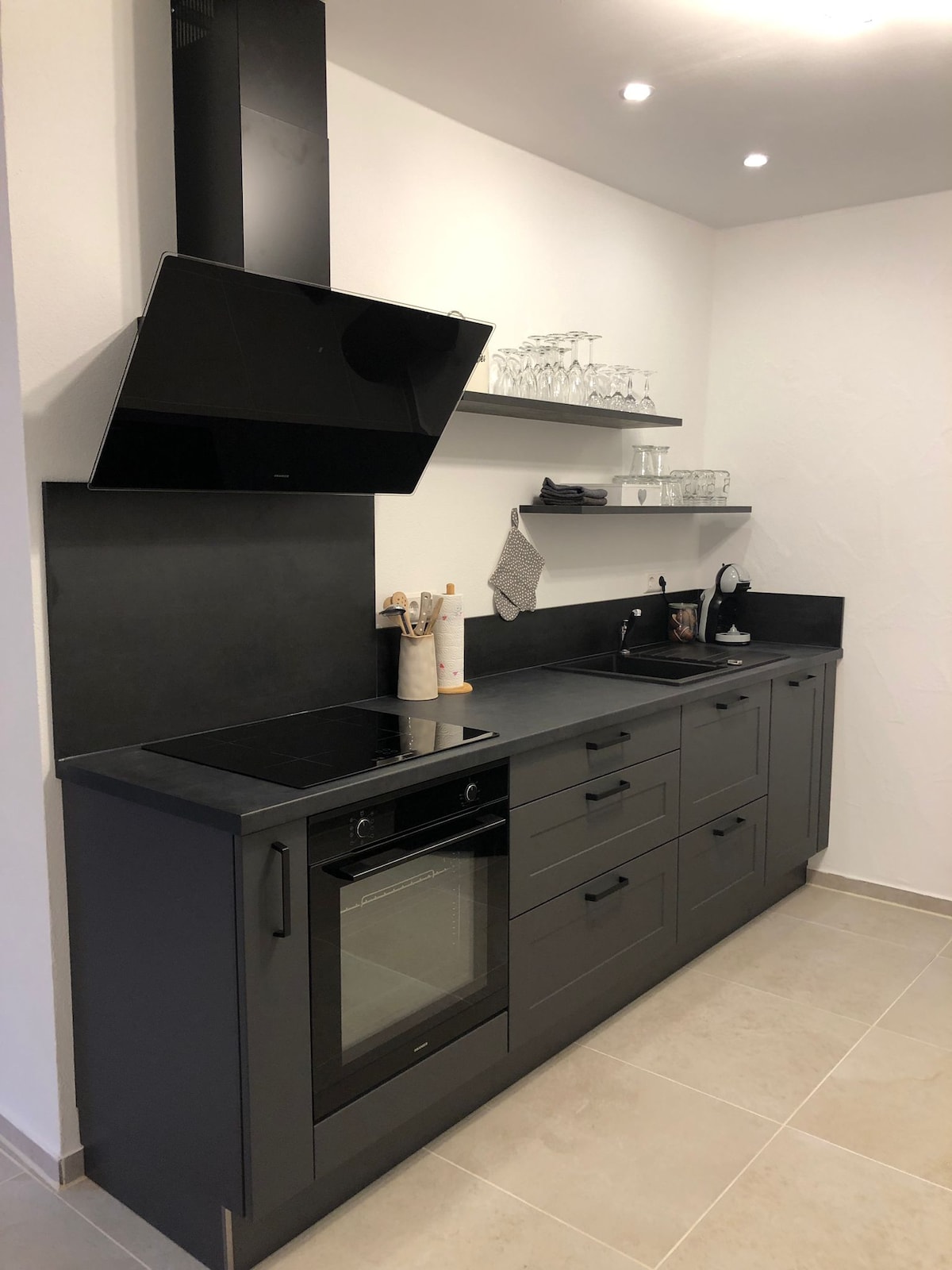 Very nice, cozy and stylishly furnished apartment in the new building. The 81 sqm apartment is on the ground floor and has a separate entrance. There is an open living and dining area with kitchen, two bedrooms and a large bathroom. The apartment is located in an idyllic small town with beautiful walking paths, vineyards and Lake Aalkistensee, which can be reached on foot. The bus stop, a train station, bakery and small farm shops are also within walking distance.