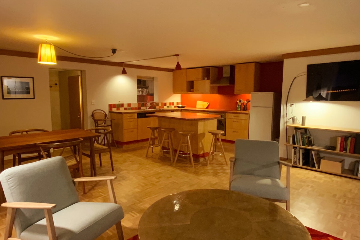 A cozy rural retreat invites you to unwind! This newly renovated room, styled in alpine chic, features a private entrance with direct access to a covered patio. Hiking, biking trails, and ski slopes start nearby. There’s no kitchen, but a full-meal restaurant is next door, with others nearby. Shops and the train station are 5-10 minutes away on foot (0.5-1 km), and the bus stop is just 250 meters away. Free parking available.