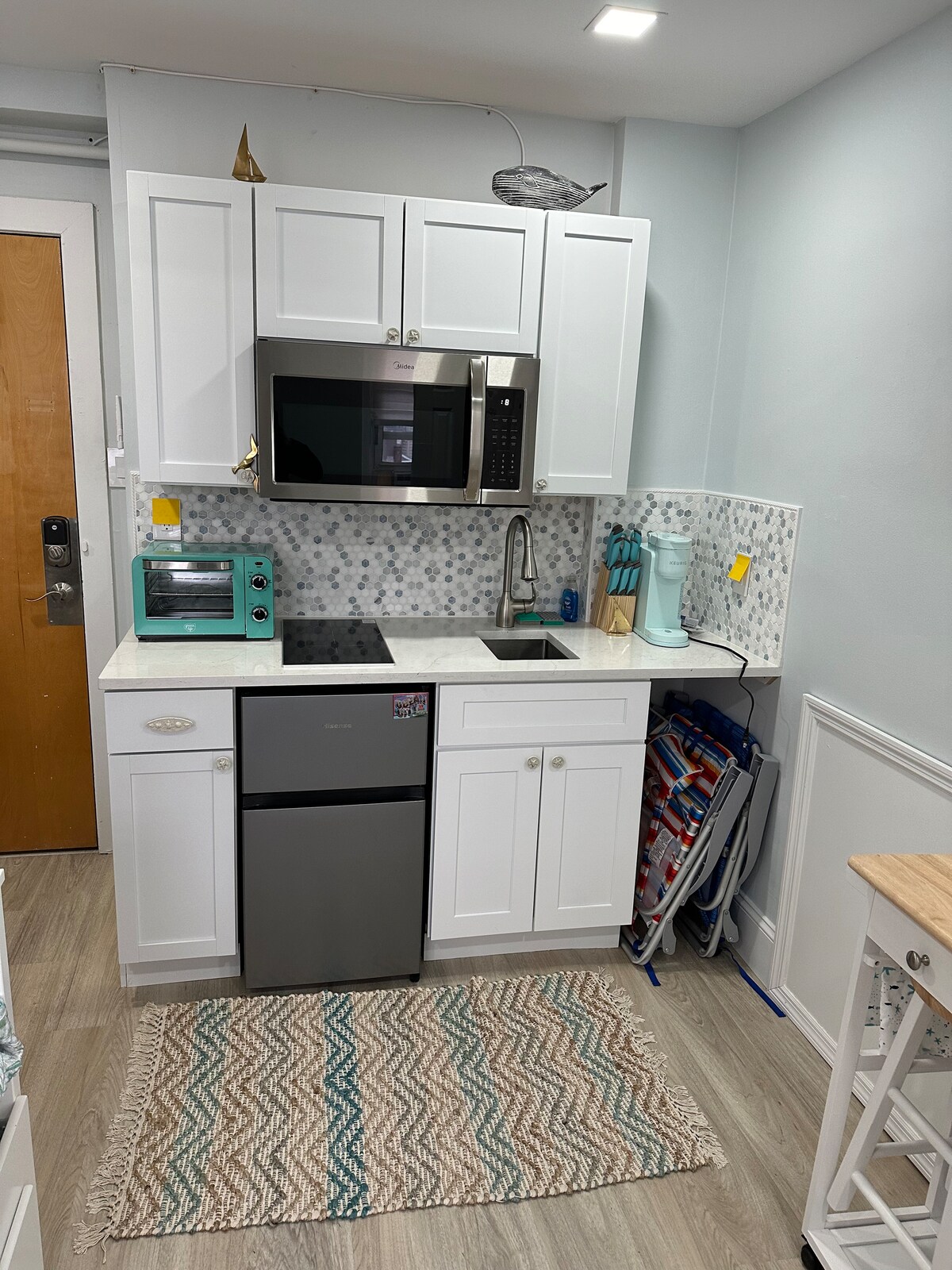 Welcome to beautiful Ocean City NJ. Enjoy this studio apartment inside the Hanscom Hotel located only a block away from the beach. This affordable unit sleeps 2 guests comfortably with a full size couch with a pull out queen size bed which helps with maximizing the space and makes the unit more comfortable. The unit has a kitchenette, mini refrigerator and microwave. The unit also has a smart tv with cable and WIFI. Laundry and vending machines are on the premises. Two beach tags are included.