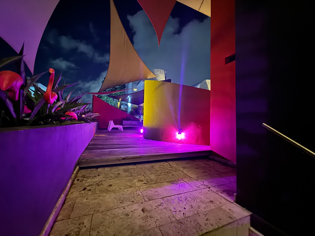 Experience tropical beach vibes in our clean and cozy 2 bedroom boho apartment in Ocean Park. Just one block from the beach, you can start your day with a morning run and stunning Caribbean sea views. Relax on our large leafy terrace, where the ocean breeze will refresh you as you enjoy your morning coffee and plan your adventures. The apartment includes a full kitchen w’ an espresso machine, two bedrooms w’ queen beds, and one bathroom, providing all the comforts you need for a perfect getaway.