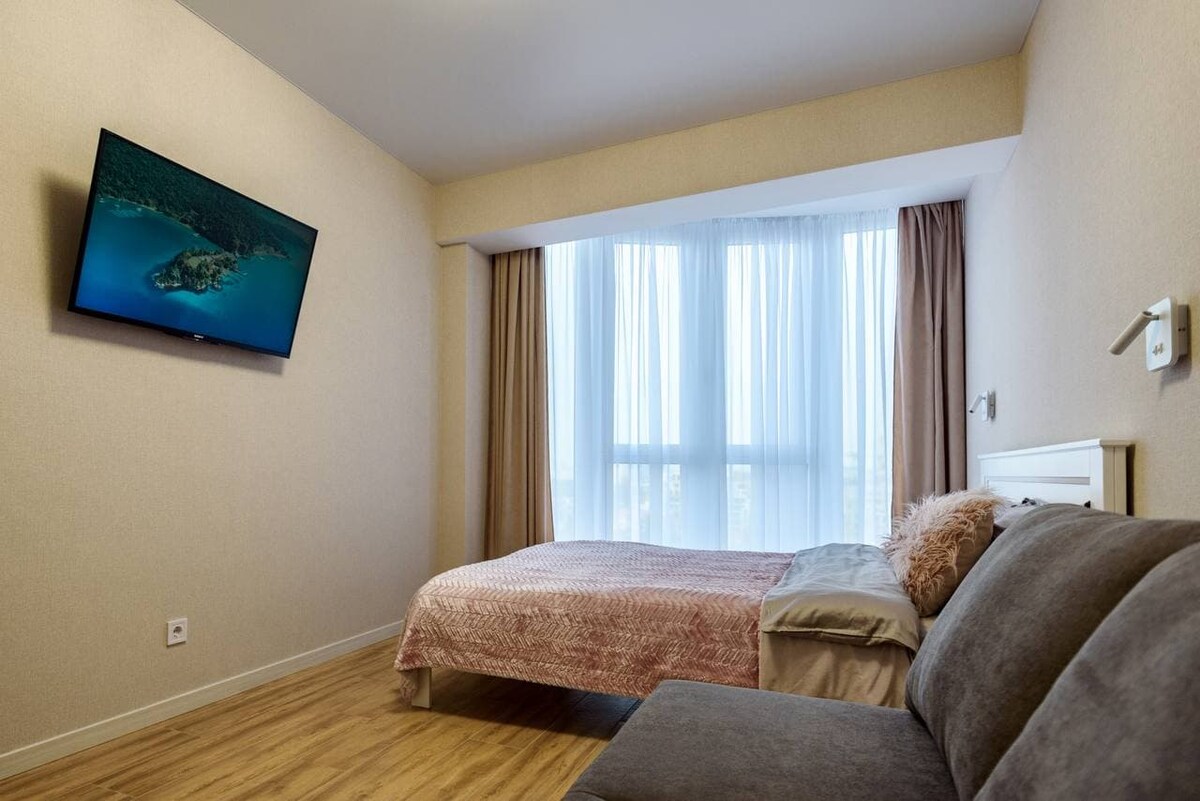 Relax and unwind in a cozy and stylish home. Our apartment is designed for a comfortable stay. It is located in a new stylish house with a modern interior, fast Wi-Fi, air conditioning and air recirculation, and a stylish bathroom, with a hairdryer and an electric towel dryer. The apartment has a large 43-inch TV, microwave, tea set, set of dishes, fridge with freezer, bathrobes, hygiene kits, soap, shampoo, scales.
