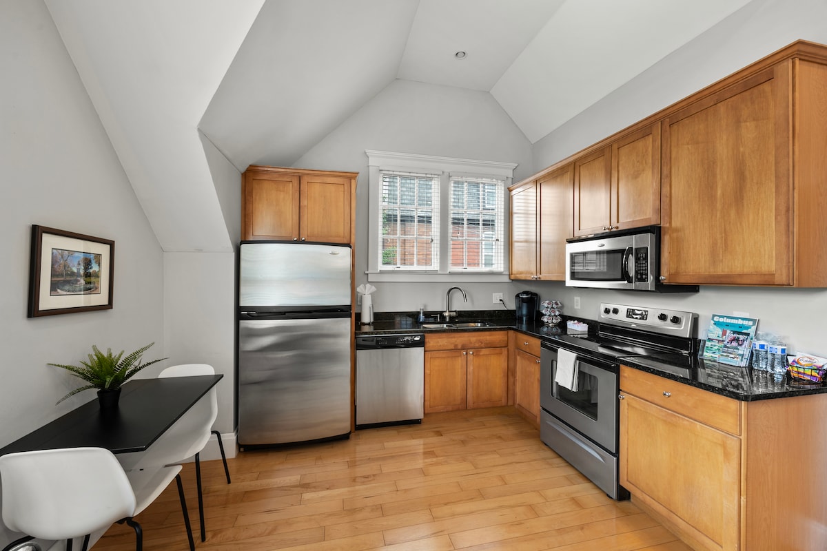 At this ground-floor studio in the Short North Arts District, you’re a quick walk to galleries, bars, brunch spots, and the OSU campus. Inside, it’s clean and well-lit with a king bed, crisp linens, and a small kitchen island where you can eat, work, and steep something hot. This setup and location are great for solo stays or an intimate weekend for two—smart, comfy, and close to everything worth leaving for.