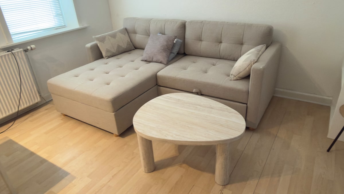 Apartment of 107 m2 centrally located in Esbjerg. Walking distance to inner city sights. The apartment is divided into two floors that have everything, as well as a cozy garden with a covered terrace, which is unique for such a central location. The bedroom is in the basement, where there is a narrow staircase from the apartment (can be difficult to access if you are poorly walking), or a separate entrance that can be used from the entrance. There is also a large inflatable air mattress in the living room as a bed for the 3rd person.