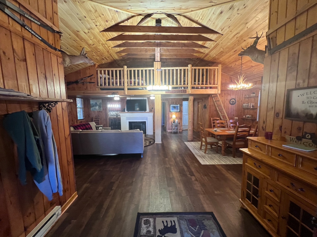 Appreciate the beauty of the Adirondacks and enjoy the comfort of a carefully decorated home that promotes relaxation. The first floor has an open concept and includes a spacious kitchen, dining area, and a welcoming living area with a high cathedral ceiling and a fireplace insert. Cozy up and read by the fire, watch TV, or play some board games. As the sun sets, enjoy a relaxing soak in an oversized whirlpool tub and then retire to one of the four bedrooms upstairs.