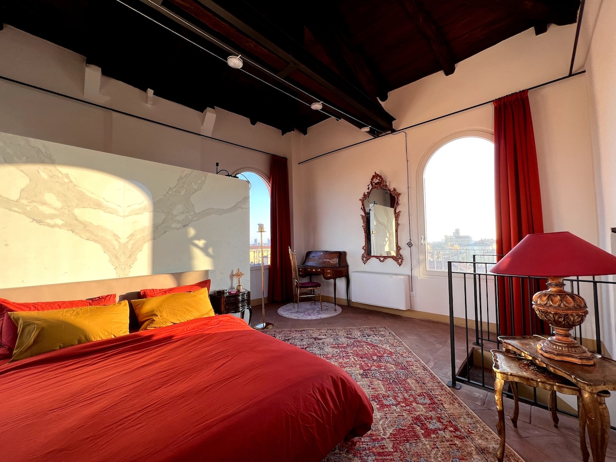 Stay in the most spectacular Altana in the city, a refuge suspended between sky and history in the heart of Bologna. Let yourself be enchanted by a breathtaking view embracing Due Torri, San Petronio, and the Sanctuary of San Luca. “Tower of Lovers”, nestled within the prestigious Palazzo Bocchi, is a magical retreat steeped in alchemical secrets and legendary love stories.