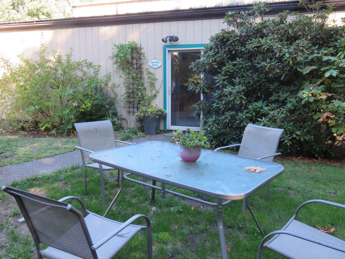 Take it easy at this unique and tranquil getaway. Private enclave in a quiet, park-like setting that feels like you are out in the forest but you are still close to the Capitol Campus, downtown, and West Olympia amenities. Daylight basement studio apartment with private entrance, off-street parking, and stocked kitchenette. Located within a short walk to westside food coop, one block from bus stop and nature trail to waterfront and downtown Olympia.