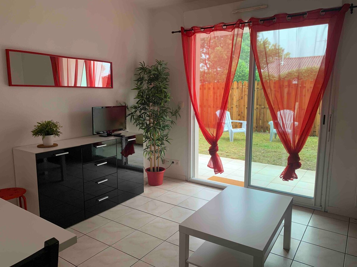 Fully equipped studio with a small private pool, as well as air conditioning. A few minutes from the beach and the city center. Quiet and green environment. 2 bikes available. Close to Hossegor, Capbreton, Biarritz. Everything can be done on foot or by bike. In summer free beach shuttle 300 meters away. Rented with sheets, towels and cleaning product. Adults only.