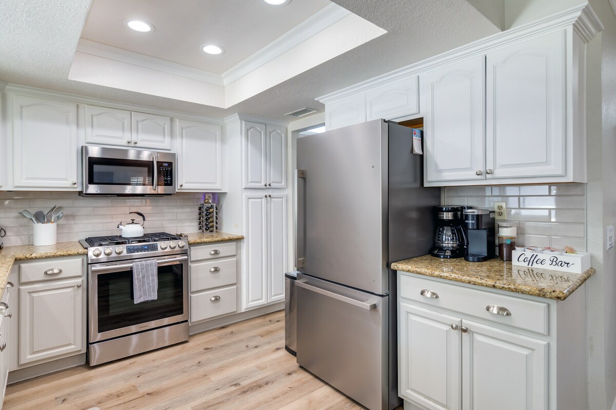 This beautiful remodeled home is located in a safe quiet cul-de-sac & has been tastefully furnished with all new furniture. It can comfortably host 8 guests with 4 bedrooms, dedicated work station, 1 Gig fiber optic internet, a well equipped & stocked kitchen, two comfortable lounge area, two 55inch TV, beautiful dinning area, fireplace, spacious outdoor dining, fire pit, gas grill for your outdoor cooking pleasure, well lit outdoor area, indoor laundry, central AC & heating & much more.