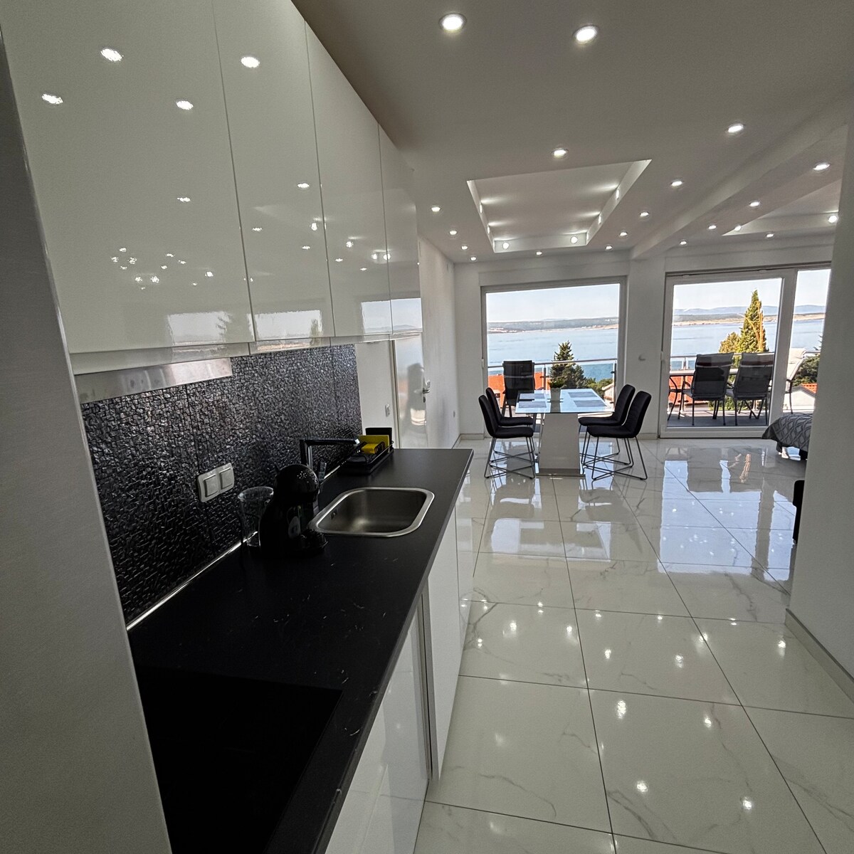 Accommodation is in new modern black and white apartments located in Dramalj near Crikvenica. House is 150 away from the sea and has a breathtaking view of the sea. Enjoy your glass of vine or morning coffe on large balcony and forget all your worries. Our host, Monika, will make sure you have everything you need and will be available at all times during your stay. Wash away all your worries in our pool with jacuzzi. Pool is heated at 28°C.