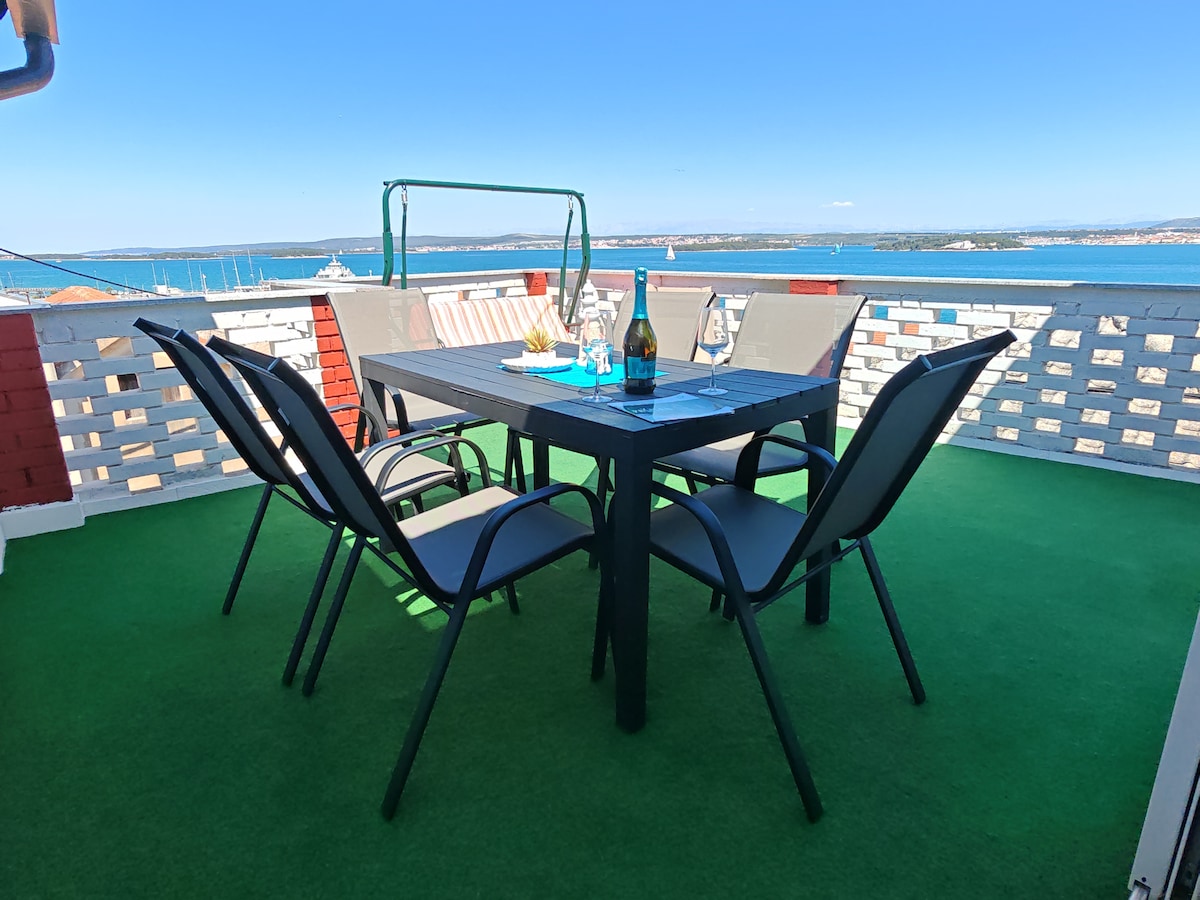 The apartment consists of two bedrooms, a bathroom, and a kitchen with a dining room that has a large balcony overlooking the sea. The apartment is 60m2. Within the building there is a sun terrace, from which you can go to the beach. The apartment is perfect for a family vacation with children. We are located in Tkon, on the island of Pasman, connected to the mainland by ferry lines with a 15-minute ride. Tkon has a market, shops, restaurants, a doctor and a pharmacy. In front of the house in the sea, you can moor a boat up to 6 meters on the buoy.
