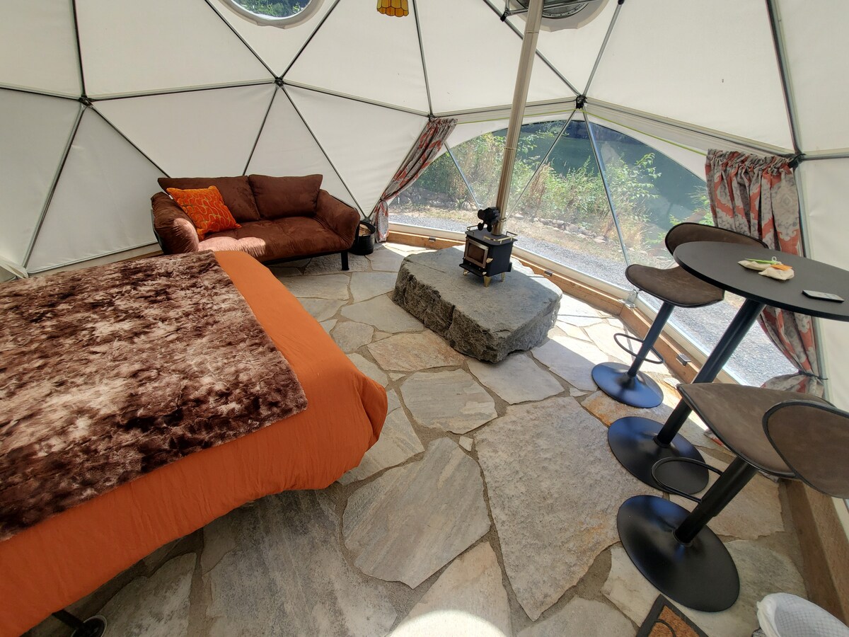 With nearly half of the dome’s surface clear, you will be as close to nature as it takes, yet feel completely safe and cosy. Our dome is equipped with insulation, AC and a heater, ensuring a pleasant climate inside regardless of the weather. Step onto the plush carpet underfoot, adding comfort to your glamping experience. The dome is equipped fast & reliable Wi-Fi, ready for a cozy day in bed and busy workday. This property is off grid, with a porta potty, no shower and no running water.