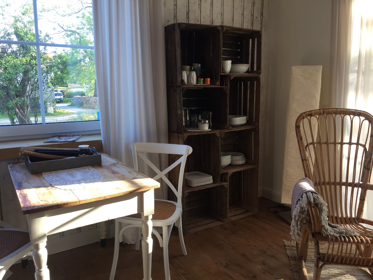 Wind whispers, fairytale living by the sea - Haus Sterntaler All apartments in the Sterntaler house are lovingly furnished in a romantic, fairy-tale ambience and at the same time have comfortable furnishings: TV, stereo radio/CD, Internet/Wi-Fi as well as modern kitchenettes (with microwave, stove, refrigerator, coffee maker, toaster, kettle, etc.). The apartment on the 1st floor offers you a nice terrace, a cozy living/dining area, separate
