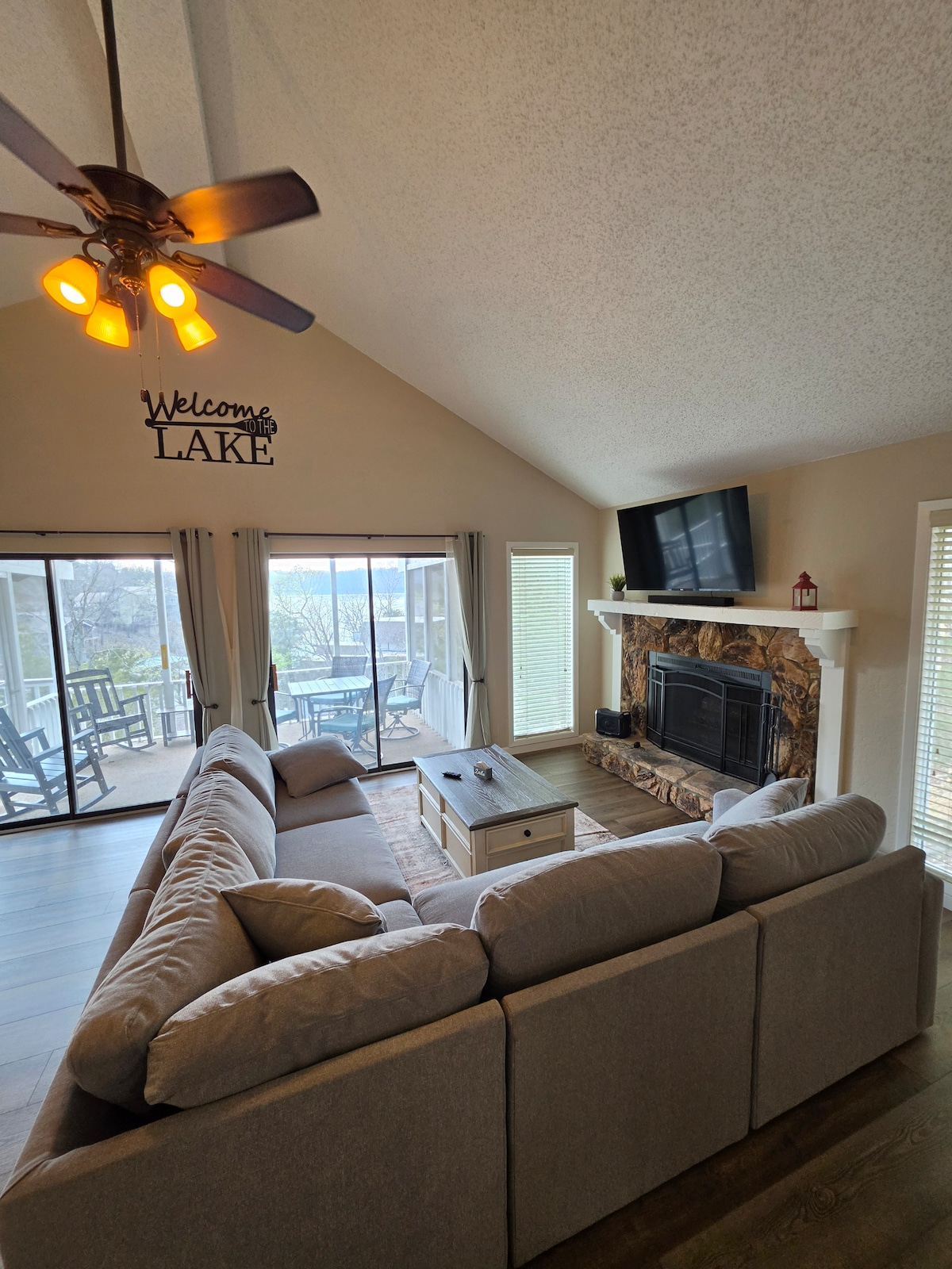 Enjoy a prime Osage Beach location with restaurants and a grocery store within walking distance, plus quick access to waterfront favorites like Dog Days and Backwater Jacks. The outdoor space features lake views, a private patio with pergola, dining table for six, custom cornhole boards, charcoal grill, and a bonfire area with firewood included. Over 140 outdoor lights create a warm evening atmosphere, and 50 ft of private parking easily fits a truck, trailer, boat, or up to three vehicles.