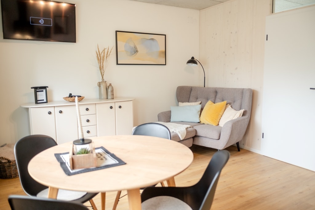 Die Wohnung (53qm) befindet sich im Untergeschoss unseres neu gebauten Hauses, hat eine voll ausgestattete Küche, Bad mit Dusche und WC, Schlafzimmer mit Doppelbett und Schlafsofa, sowie ein Sofa mit Schlaffunktion im Wohnraum. Über eine Treppe erreicht ihr die Wohnung und könnt im Lichthof gemütlich sitzen und grillen...