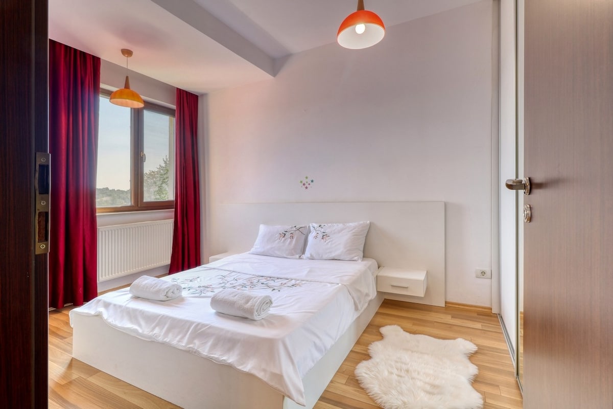 La Boheme Therme apartments, 5km away from Therme Complex, the biggest in Europe, have all the necessary facilities to make your family stay exceptional. With a modern air, the apartments have a bedroom with king size bed, bathroom completely equipped with washing machine, walking shower, towels, a living room with sofa bed, 4K Ultra HD Smart TVs with a 163 cm diagonal, open space kitchen completely equipped with microwave oven, an electric oven, stove, dishwasher , dressing room and balcony.