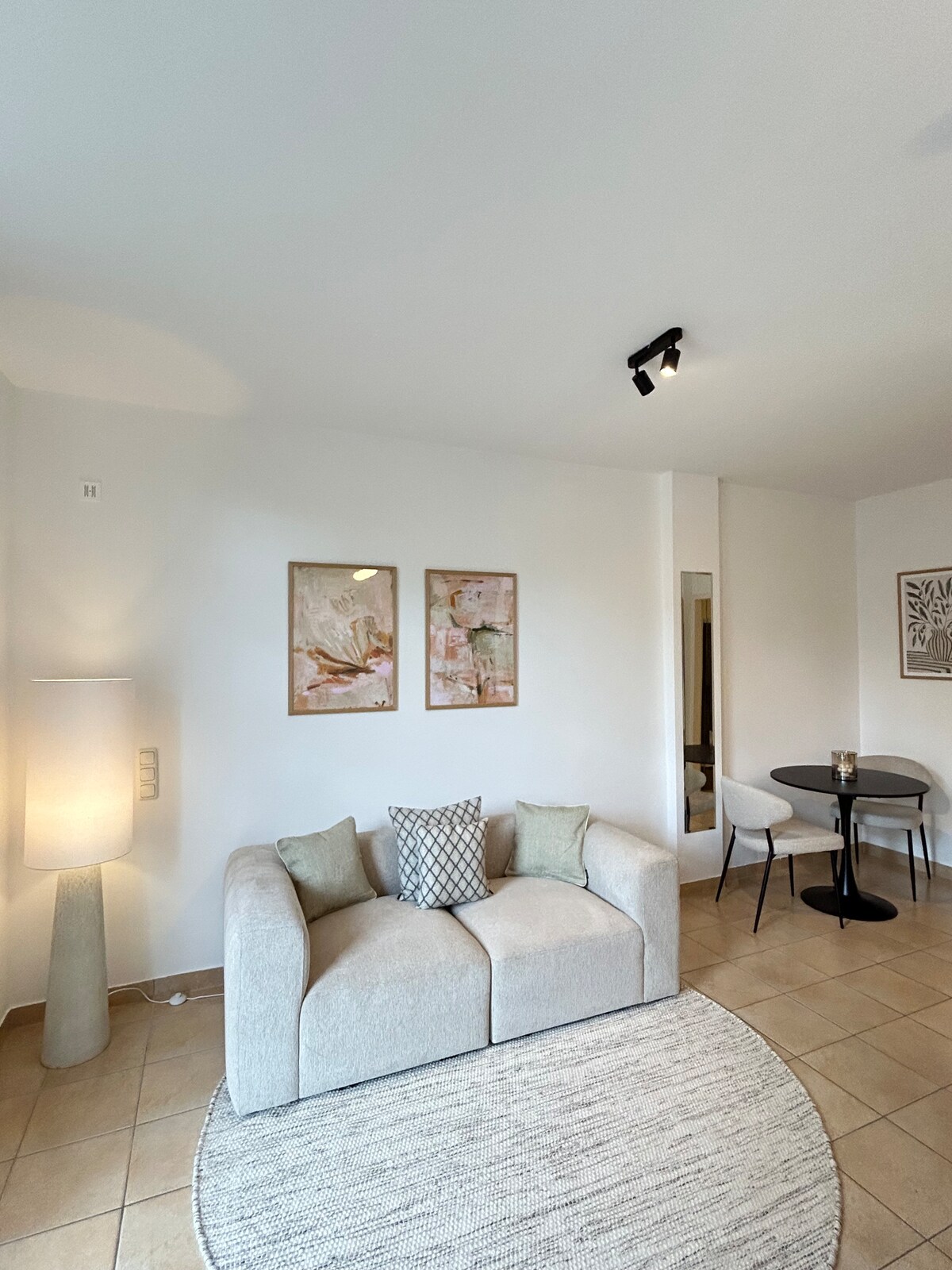 The furnished room features a double bed (convertible into two single beds), a fully equipped kitchen with a microwave, oven, and dishwasher, as well as a bright bathroom with a shower and window. Amenities include a wardrobe, dresser, dining table, sofa, smart TV, underfloor heating, air conditioning, and a terrace with seating. A washing machine and dryer are available free of charge. There is good road access and parking. Cologne can be reached by bike in about 45 minutes.