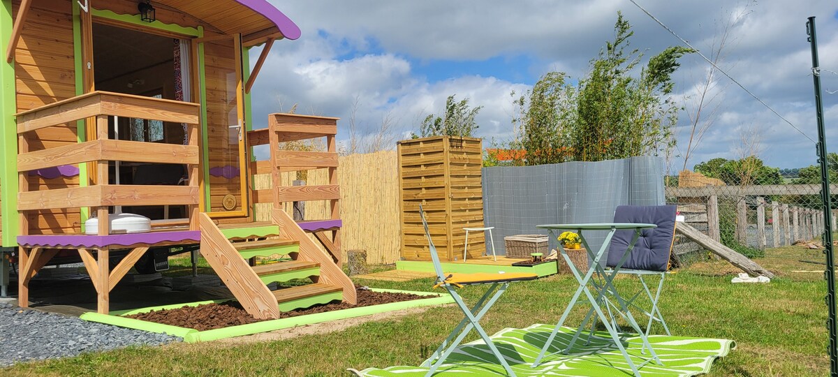 Installée en pleine nature aux portes de la suisse normande vue sur les champs, bois et les animaux. La roulotte zen vous promet un vrai moment de détente pour faire le plein d énergie en se connectant avec la nature. Possibilité sur place : Massage Bain nordique réservation petit déjeuner activités dans la région: équitation ,escalade ,GR suisse normande ,piscine restaurants Possibilité d accueillir cavaliers avec leurs chevaux . Possibilité de récupérer randonneurs du GR suisse normande.