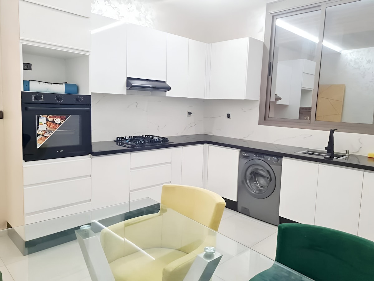 Perfect for families, couples, or groups up to 4 guests max. Free on-site parking inside the building safe, convenient, and perfect for guests with a car. Well-kept apartment with 2 bedrooms, cozy living room, equipped kitchen, large bathroom, and Wi-Fi. Shops, pharmacy, restaurants, and BIM supermarket just downstairs. Just 15 min from the airport, within walking distance to the medina & CTM, and 10 min to Aïn Asserdoun waterfalls by a taxi or a car. .