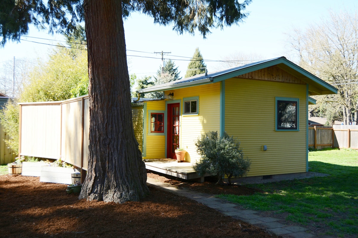 Welcome to our cozy pet-friendly 400 sq. ft. cottage in SE Eugene with a free EV charger! Steps from the peaceful Amazon Trail. Perfectly located within walking distance to restaurants, grocery stores, and within 3 miles of the University of Oregon. It’s an ideal retreat for exploring Eugene. Enjoy a quiet, charming space with all the essentials for a relaxing stay, whether you’re here for a game, a walk through nature, or to soak up the local vibes!