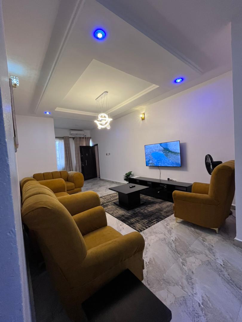 This cozy apartment features one bedroom with classy wardrobe and fans Sitting room with television air condition fans and work place Modern equipped kitchen with gas stove fridge freezer toaster kitchen utensils and microwave Bath room with shower situated in a gated community and built in a gated spacious compound with free parking and renowned security Provision for three exterior cameras supported with flood light .Solar powered 24 hours coolness backed up with 40 KVA generator.