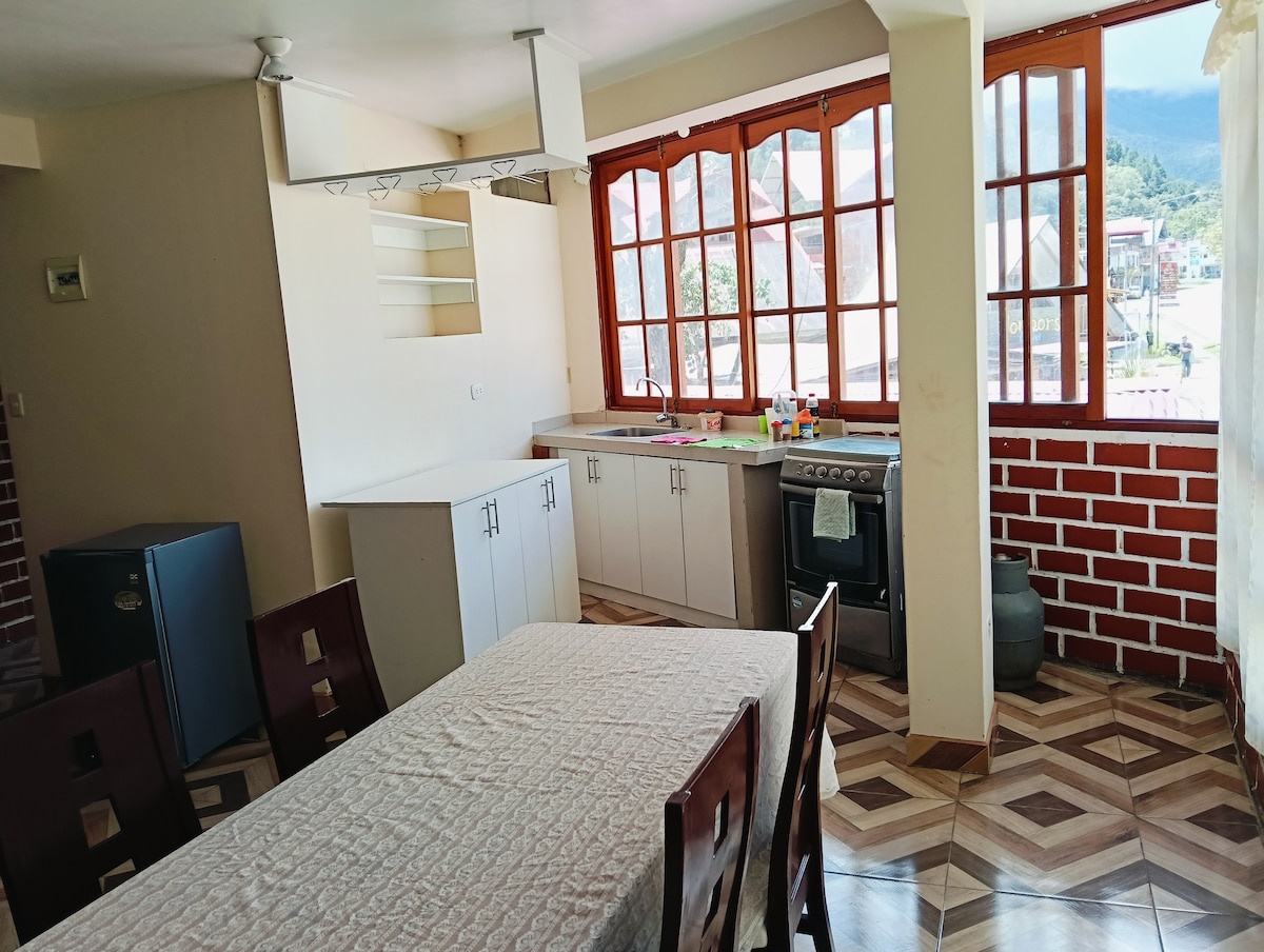 Enjoy our 2 bedroom Mini Depa with full equipped Kitchenette, Starlink high speed WiFi and shared laundry. 9 blocks from the Plaza de Armas in urbanization of affirmed streets, WE ARE not IN the CENTER but close. View of the mountains and valley, ideal for families, couples or friends looking for the perfect combination of tranquility, comfort, beautiful views of the countryside but just a short walk from the center of Oxapampa and at a reasonable price. Book today and create indelible memories!
