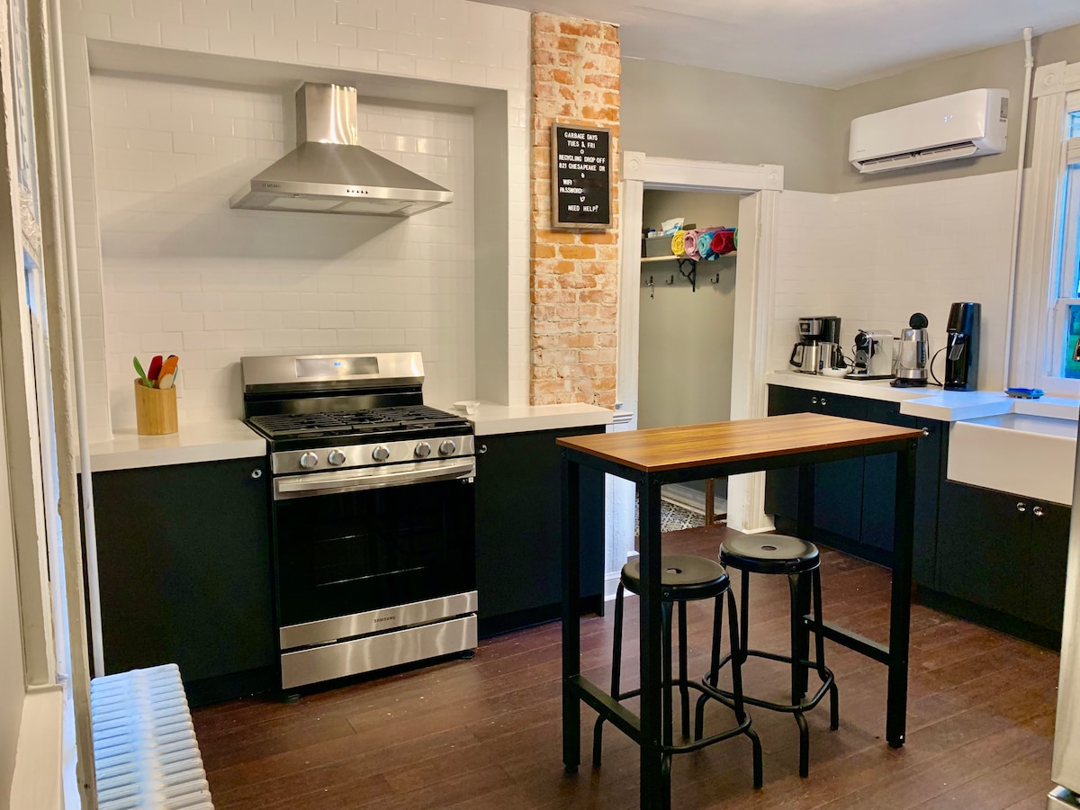 Berkeley hall is centrally located in historic Saint Michaels. Park your car and walk to everything! Great shops, restaurants and 3 blocks to the water. First floor includes a high ceiling parlor that connects to a lovely side porch and large kitchen. There is a mahogany staircase that takes you to the 2nd floor that has 2 master suites. One has a king bed the other has a queen bed w/ ladder to loft which is best for kids -has a twin size futon sofa bed. Perfect home for a romantic getaway.